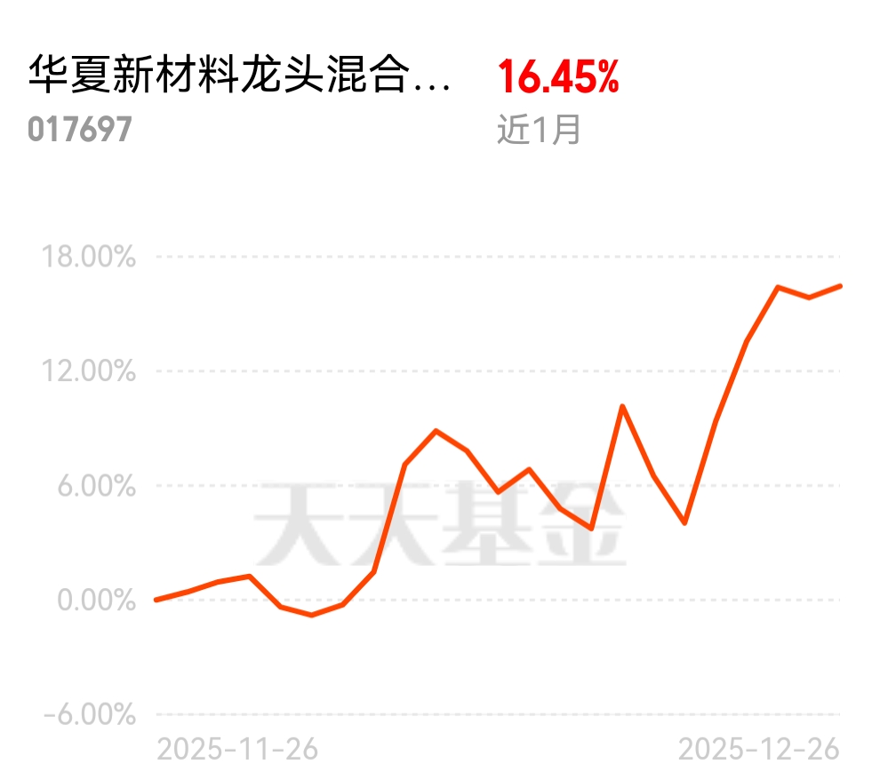 近一个月涨了16.45%,表现还不错,收益在同类产品中排名前列,趁还没涨起来赶紧多拿点$华夏新材料龙头混合发起式A$
