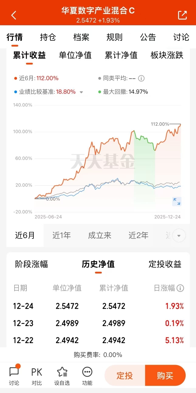 好基的体验就是“账户常红”。平台显示,这基近一年有42天都在创新高,比八成以上的同类都强。这意味着你随便哪天打开,很可能都在盈利,加上1年121%+的总收益,尤其是半年112%的翻倍业绩,幸福感拉满!$华夏数字产业混合C$