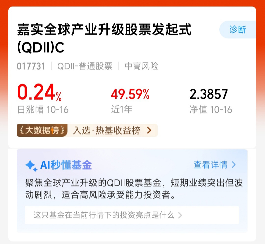 在此背景下,$嘉实全球产业升级股票发起式(QDII)C$ 展现出其全球配置的价值。该基金近一年收益达49.59%,表现稳健。其策略并不局限于A股,而是放眼全球,聚焦于人工智能、高端制造等产业升级核心赛道,重点投资如英伟达、超威半导体、高通、中芯科技等一批在科技产业链中具备领先地位的科技企业。随着海外市场逐步回暖,叠加AI技术革新等长期动力,这类能够横跨A股与海外、紧跟全球产业趋势的基金,有望在波动中捕捉更多成长机遇。