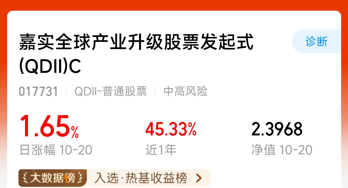 $嘉实全球产业升级股票发起式(QDII)C$ 昨天这个涨了1.65%呢,主要在a股还有美股的方向都有布局呢,同类业绩也是稳定上涨的趋势呢,近半年涨了68.03%,对比纳斯达克要强一些,在当下科技的迅速发展,我方向还是科技为主。我继续拿稳自己的筹码!