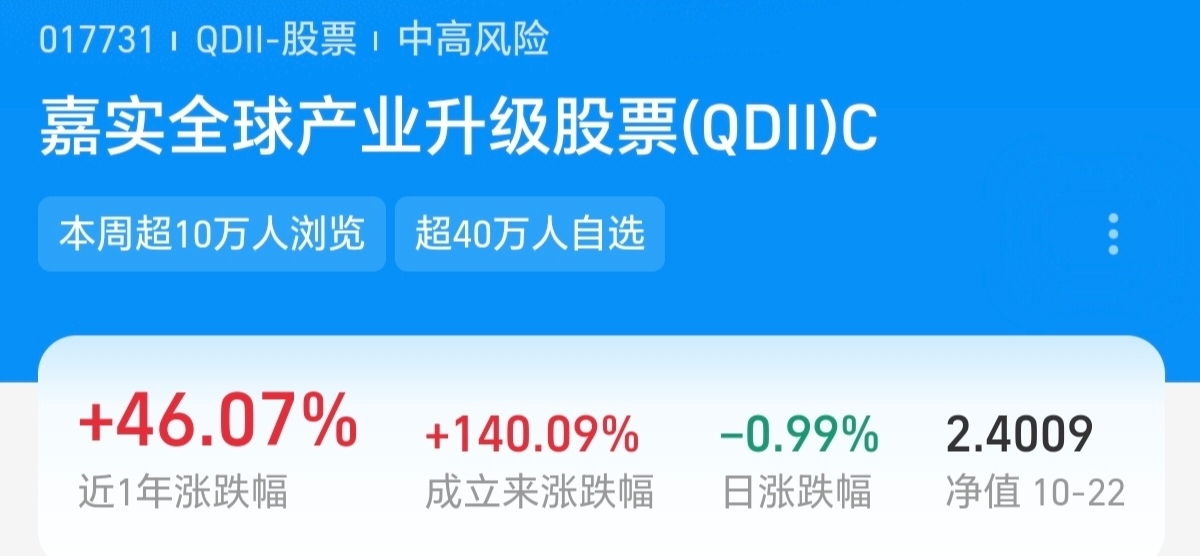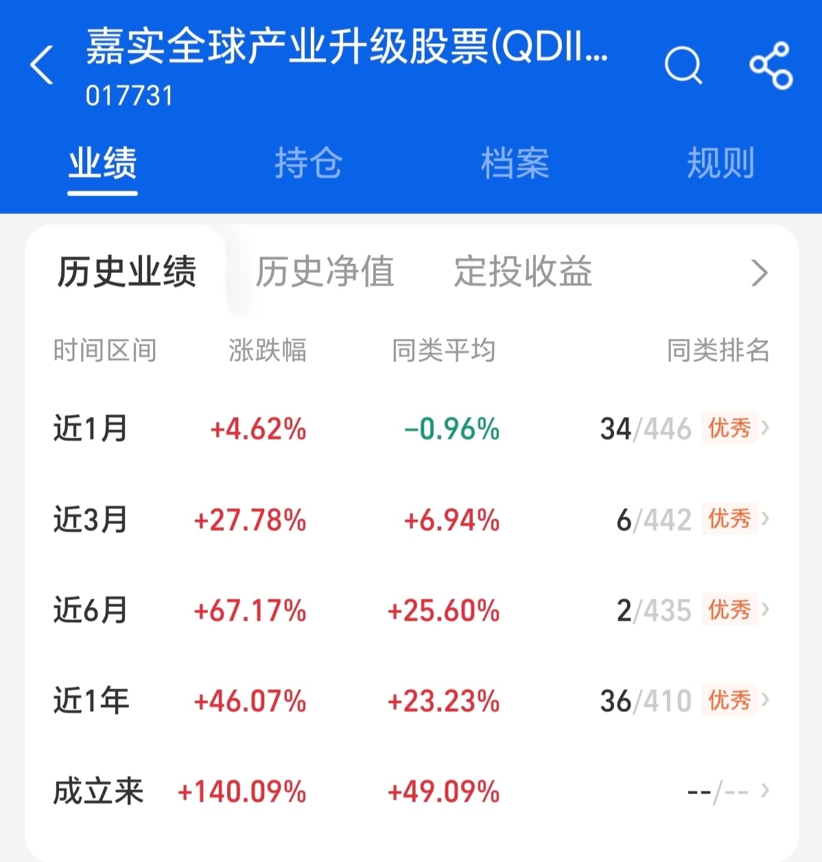 美股市场三大指数全线收涨,道指涨0.3 1%,标普500指数涨0.58%,纳指涨0.89%。 嘉实全球产业升级股票(QDII)$嘉实全球产业升级股票发起式(QDII)C$ 表现非常棒,近1年涨了46.07%,成立以来更是涨了140.09%,比同类平均和沪深300指数都好不少。