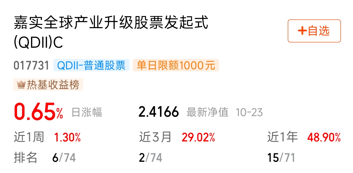 这一波也是稳了,今天的行情比较乐观,大盘4000点绰绰有余,但是今天这个控盘很精准,明显没有较大的冲4000点,目前这个$嘉实全球产业升级股票发起式(QDII)C$ 持仓也是很红呢,在美股科技有部分的持仓,近一年上涨了48个点,比一些纳斯100指数还要强势,看科技吃肉了!拿稳自己的方向!