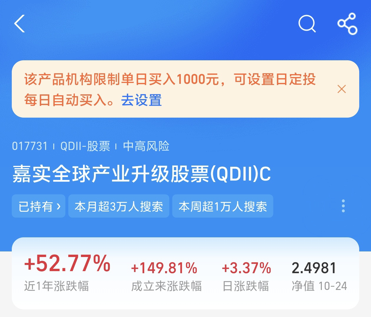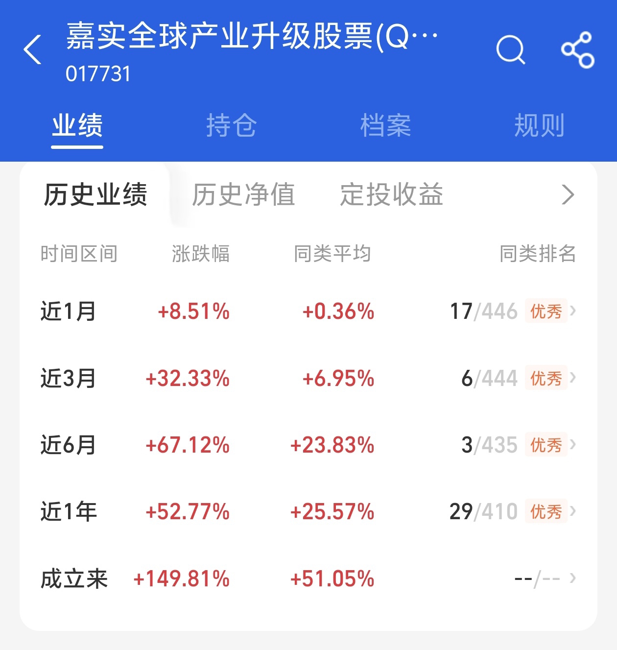 $嘉实全球产业升级股票发起式(QDII)C$ 表现的就非常的优秀。今天当日上涨了3.37%,近三个月上涨了32.33%,近6个月的收益率高达67.12%,盈利能力强。各阶段业绩在同类基金排名领先,收益率远超同类平均。基金当日限额1000元,可以长期定投。基金全球化布局了英伟达、美光科技、超威半导体、高通、中芯国际等科技龙头,降低了单一市场波动的风险,随着目前科技创新速度加快,AI、量子计算等领域不断地取得突破,科技企业营收大幅增长,将推动行情上涨。这些企业在各自的领域具有强大的技术壁垒和垄断地位。长期持有,投资回报率高,期待后期收益。