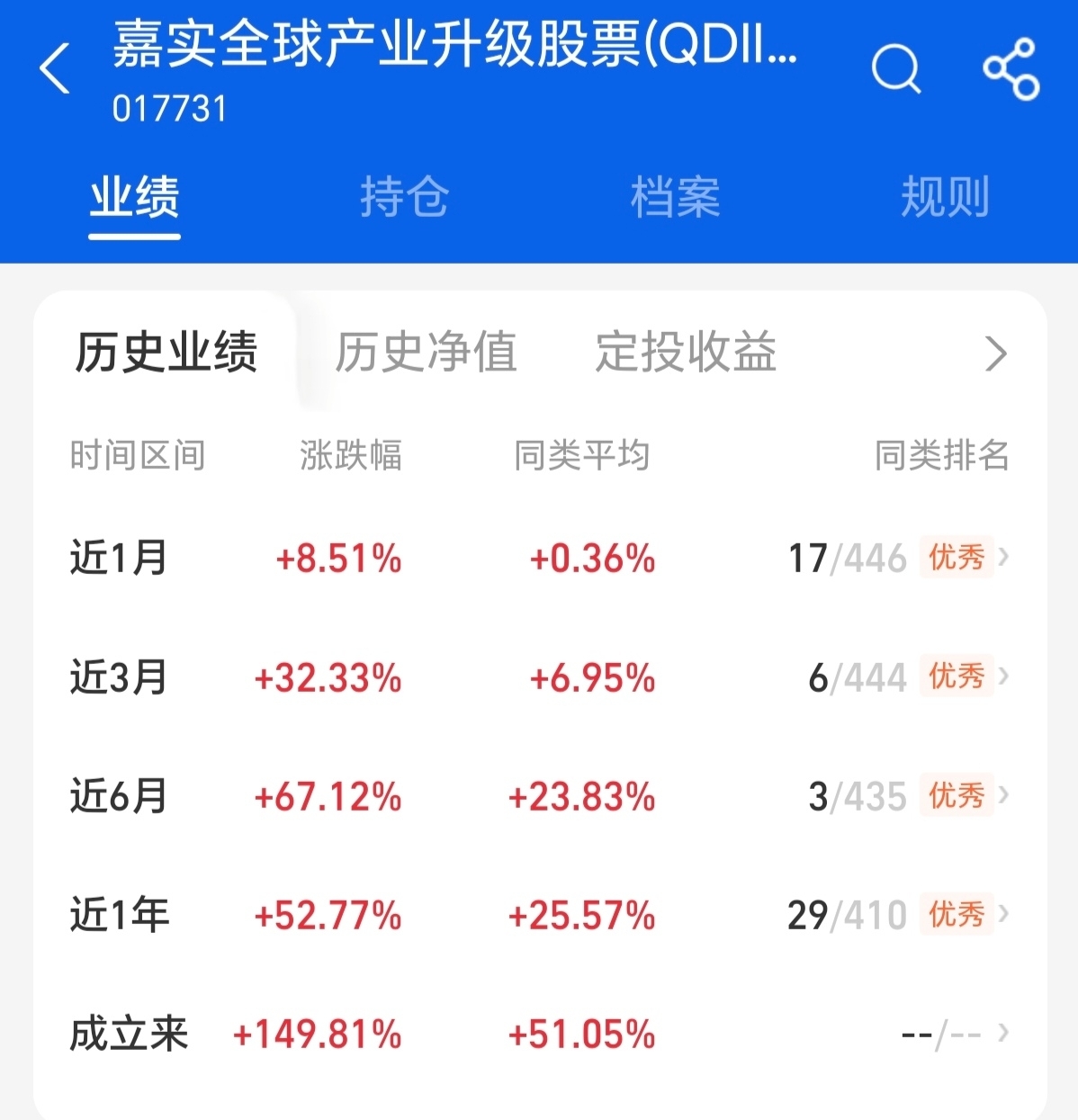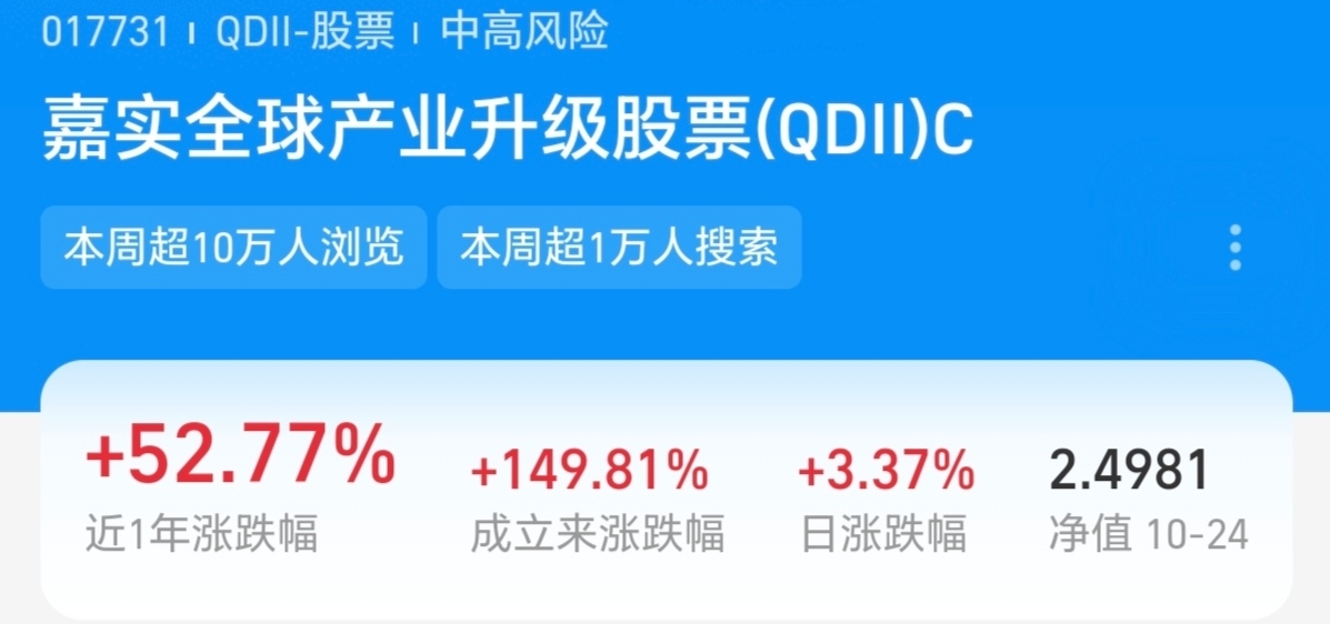 美国三大股指全线收涨,道指涨0.71%,标普500指数涨1.23%,纳指涨1.86%,均再创历史新高。特斯拉涨超4%,谷歌、英伟达、苹果均涨超2%,其中谷歌、苹果股价再创新高,苹果总市值逼近4万亿美元。$嘉实全球产业升级股票(QDIIC$$嘉实全球产业升级股票发起式(QDII)C$ 布局全球半导体龙头,持仓英伟达,新思科技等都潜力很大。最近业绩优秀,更新涨3.37%,近一月涨8.5 1%,近3月涨32.33%,近一年涨52.77%,美股降息预期升温,后面半导体科技还值得期待。