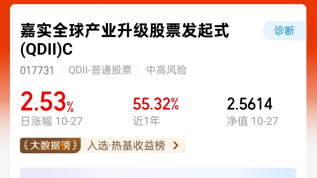 今天国内市场震荡下跌,不过刚刚美股开盘延续高开高走的态势,中美经贸磋商近日在马来西亚吉隆坡举行,双方就多项经贸议题达成基本共识,为全球经贸环境注入稳定性,最近关注的比较多的$嘉实全球产业升级股票发起式(QDII)C$ 昨天涨幅达到了2.53%表现很不错,作为一个紧扣“全球产业升级”的产品,有希望跟随这次科技板块的强势拉升持续获利。