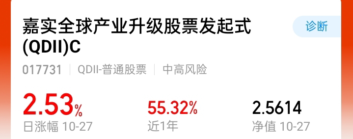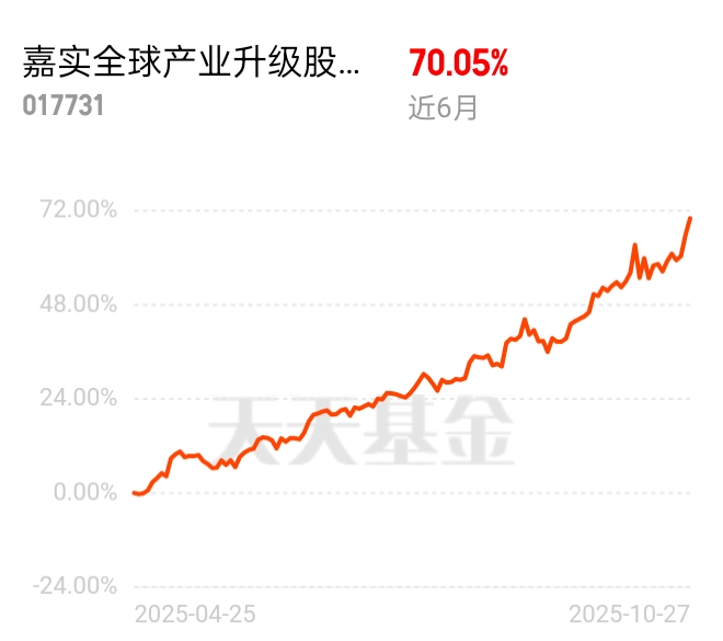近期全球市场科技股表现比较突出呀,尤其是美股方面科技股表现格外亮眼,老米9月通胀数据低于预期,强化了市场对美联储近期降息的预期,有利于科技成长股的表现,$嘉实全球产业升级股票发起式(QDII)C$ 昨日上涨2.53%,特别是近六个月涨幅达到了70.05%,很厉害,这个产品聚焦全球产业升级这条主线,在这次科技股反弹浪潮中受益不少,后续我也会继续跟进它的表现。