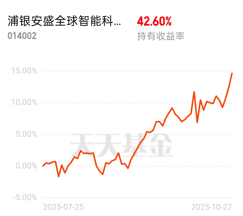 美联储降息预期不断强化叠加中美贸易谈判获得进展,大量资金涌入科技赛道,$浦银安盛全球智能科技(QDII)C$ 近一年涨超27%,加仓不限量,操作灵活,轻松跟上$浦银安盛全球智能科技(QDII)A$