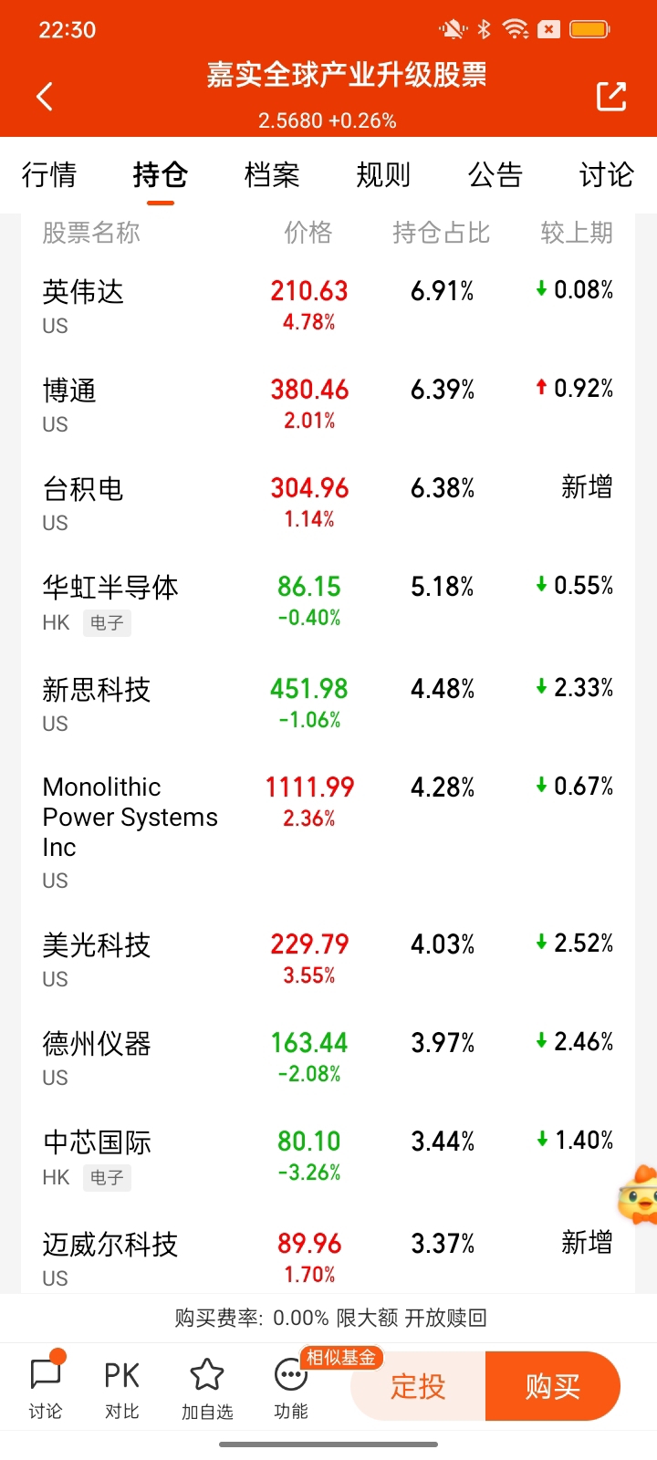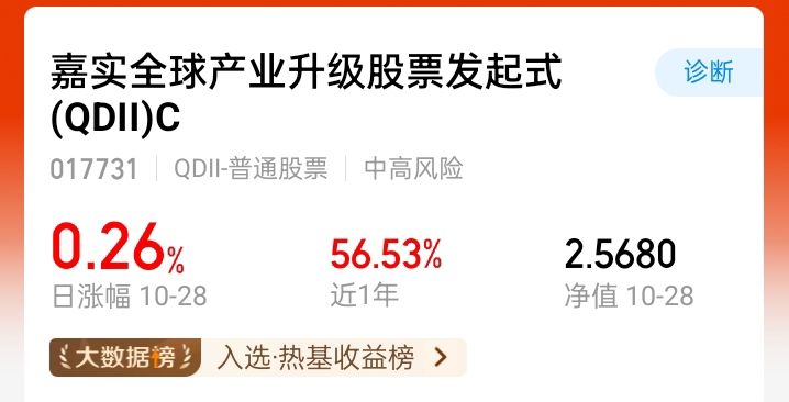美股三大指数高开高走,英伟达大涨傲视群雄,涨幅达到5%左右,CEO黄仁勋宣布,目前截至2026财年底的Blackwell、Rubin芯片订单已经达到5000亿美元!$嘉实全球产业升级股票发起式(QDII)C$ 顺应人工智能、数字经济、集成电路等科技产业发展趋势,同时覆盖美股和国产科技龙头,近一个月涨幅11.81%表现很不错,全球产业升级的主线顺应当前全球科技发展行情,持续看好这个产品后续发展。