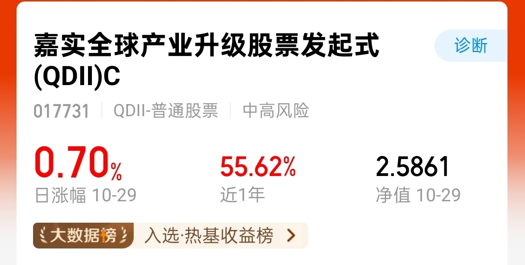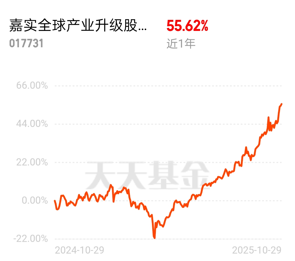 美股刚刚开盘低开低走,尽管美联储在10月的会议上如期宣布降息25个基点,但美联储主席鲍威尔在会后新闻发布会上的表态偏“鹰派”,明确表示12月会议上是否进一步降息并非板上钉钉。不过回调就是机会,$嘉实全球产业升级股票发起式(QDII)C$ 这个产品表现不错它重点布局高端制造、新能源、数字经济等战略性新兴产业,覆盖全球范围内的创新企业,昨天涨幅0.7%近一年涨幅55.62%表现很不错,在同类产品中也领先,期待后续的表现。