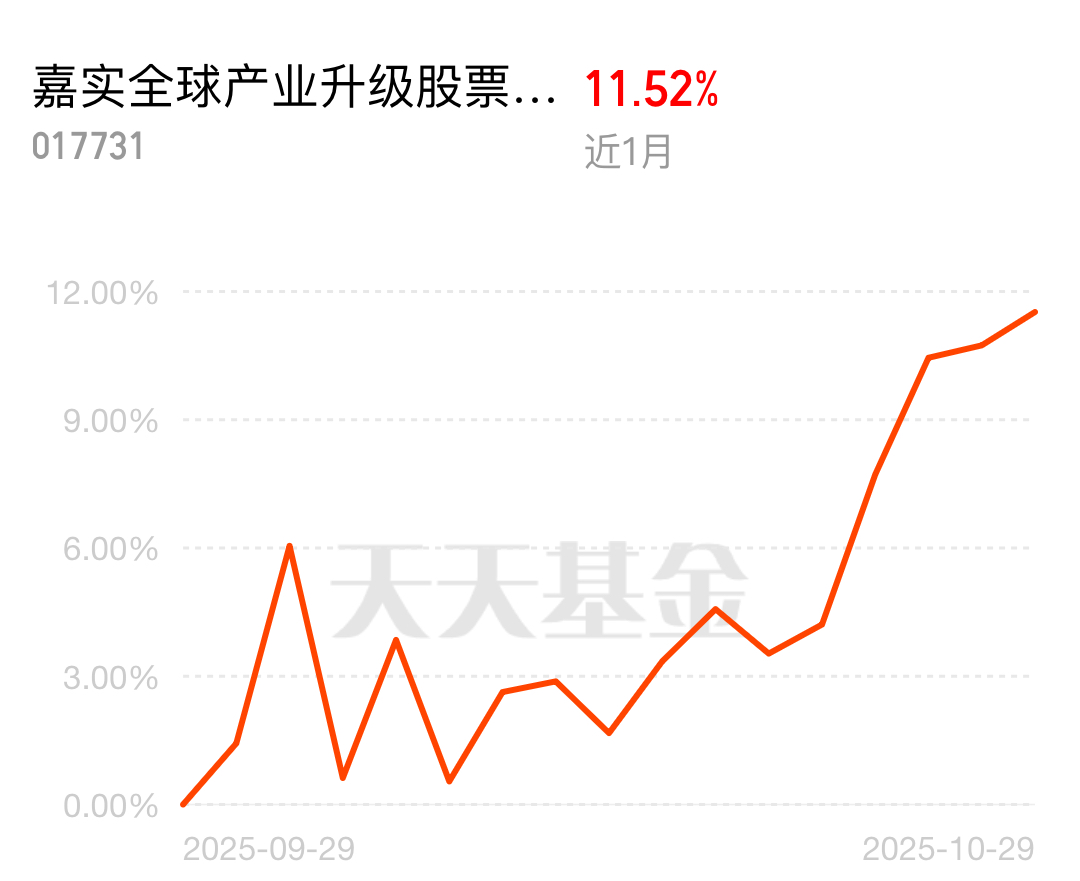 日K5连涨,月K7连阳,纳斯达克已经连续3天创新高,凌晨美联储如期降息,降息周期下,以美元定价的资产还有得冲。我准备增配手上的美股资产,就不错,今天继续拿稳不动吃肉$嘉实全球产业升级股票发起式(QDII)C$