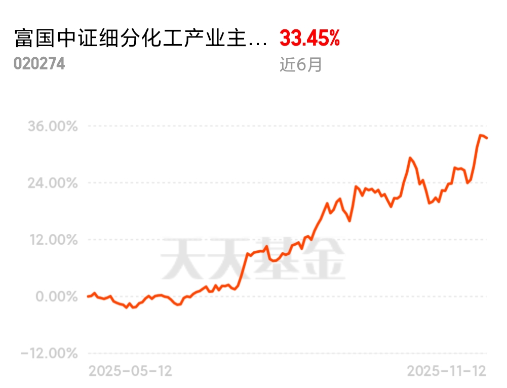 持仓嘉实全球产业升级C,也搭了点富国中证细分化工产业主题ETF联接C近6个月涨33%,跟踪误差仅0.3%,化工这波反弹跟得又准又稳。