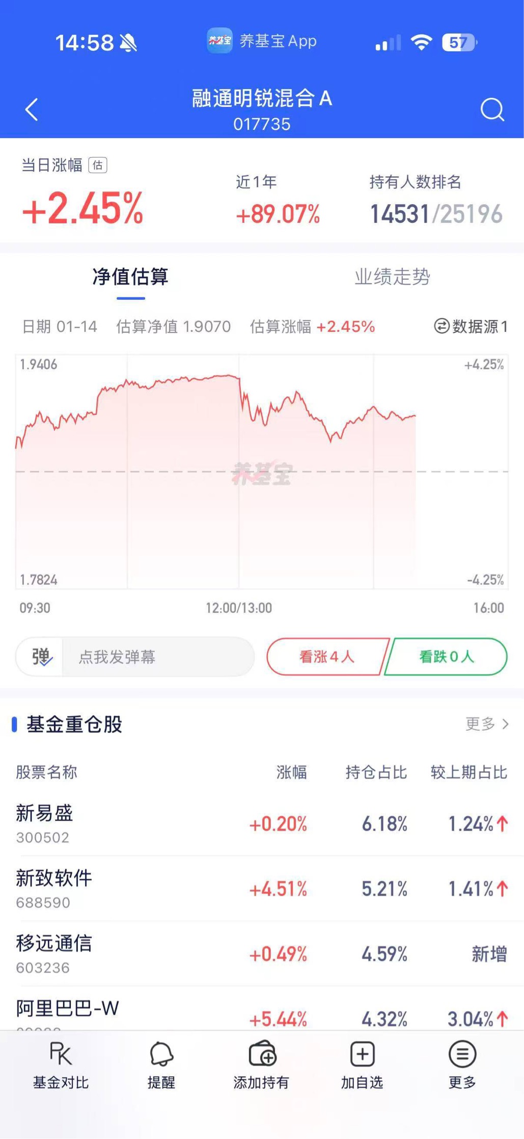 AI商业化落地提速,板块超给力!养基宝刷到融通明锐混合在涨幅榜前列,果断买入,跟