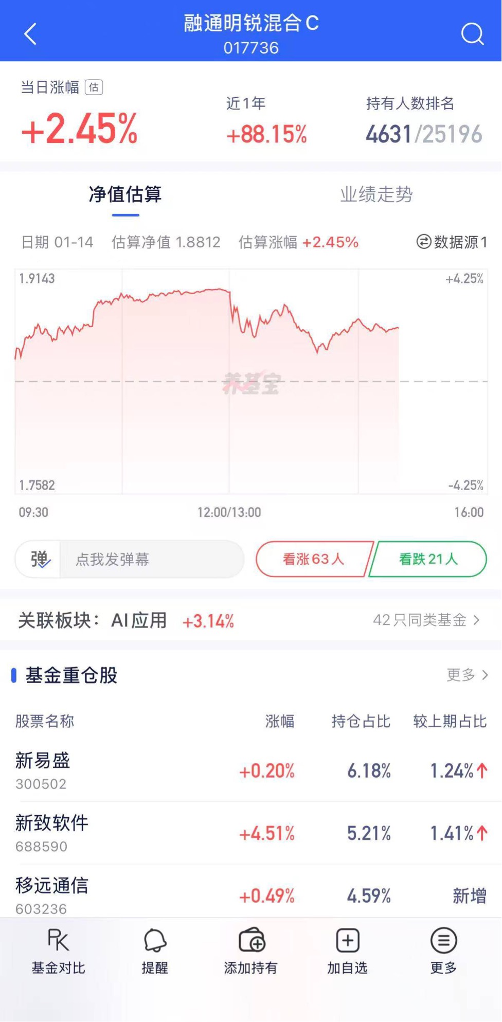 AI 商业化全面提速,市场超给力!养基宝刷到融通明锐混合稳居涨幅前排,果断跟风,坐等 AI 带来的红