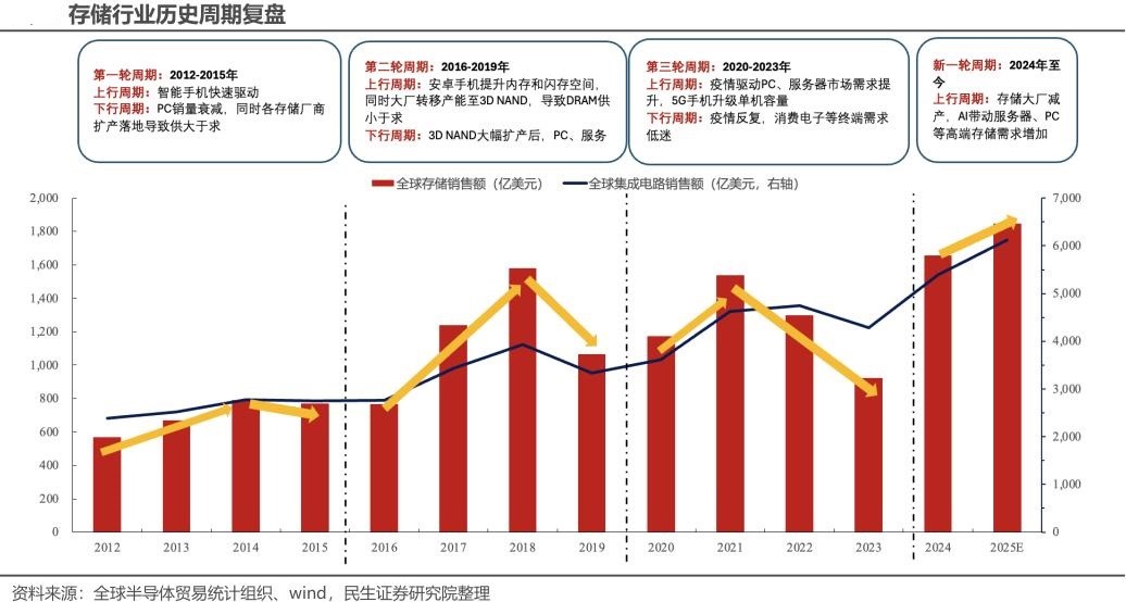自2010年至今,存储芯片产业经历了几轮由供需变化驱动的发展周期:2012-2015年,全球智能手机快速普及带动换机潮;2016-2019年,手机内存迭代升级,同时比特币矿机需求火热;第三轮是2020-2023年疫情驱动PC、服务器市场需求提升以及5G手机升级;新一轮行业上行周期从2024年至今,主要源自AI时代下多模态应用与企业级存储需求呈现爆发式增长。