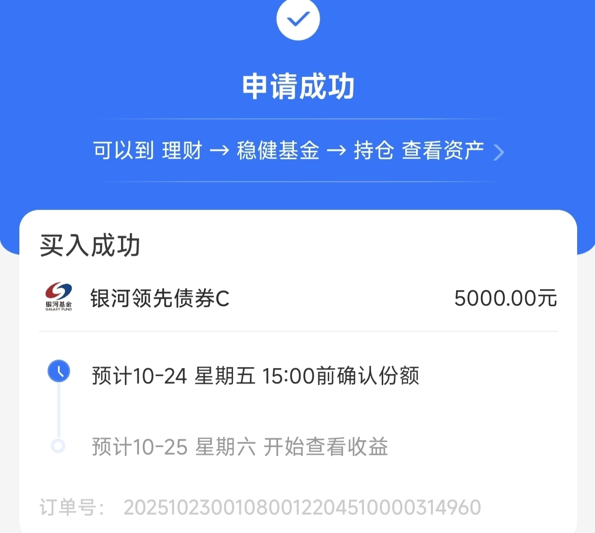 三大指数今天再度调整!短期来看还是呈现波动!今天10月的债券表现的还是比较稳,已经走出了连续修复的上涨格局!今天的信用债,利率债目前都是小晴天!今天我开始布局$银河领先债券C$ 这是稳健的纯债基金,持仓整体均衡!以稳健的信用债为主!搭配了利率债,还有小部分可转债增厚收益的攻守兼备的组合!近1月20个蛋,近一年492个蛋,稳定性的表现持续超预期!我用来做底仓长期配置!