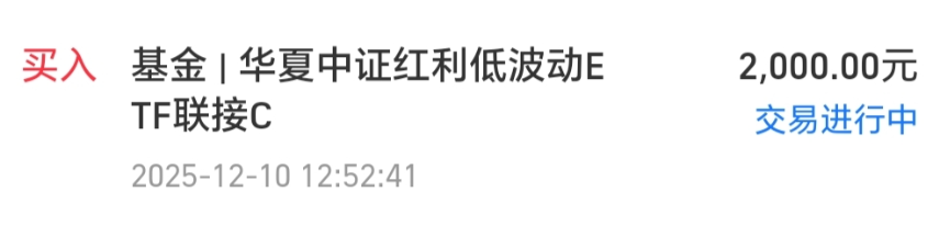 今天我买入$华夏中证红利低波动ETF发起式联接C(OTCFUND|021483)$2000块钱。