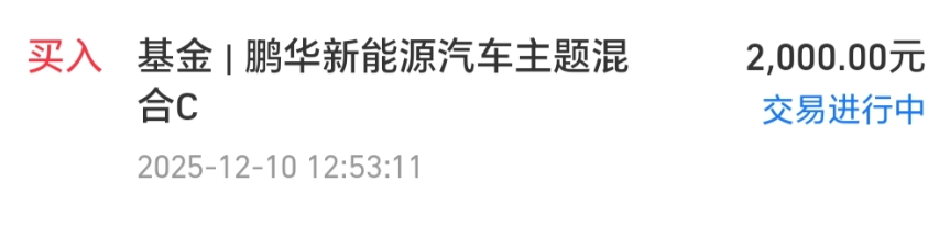 今天我买入$鹏华新能源汽车混合C(OTCFUND|016068)$2000块钱。