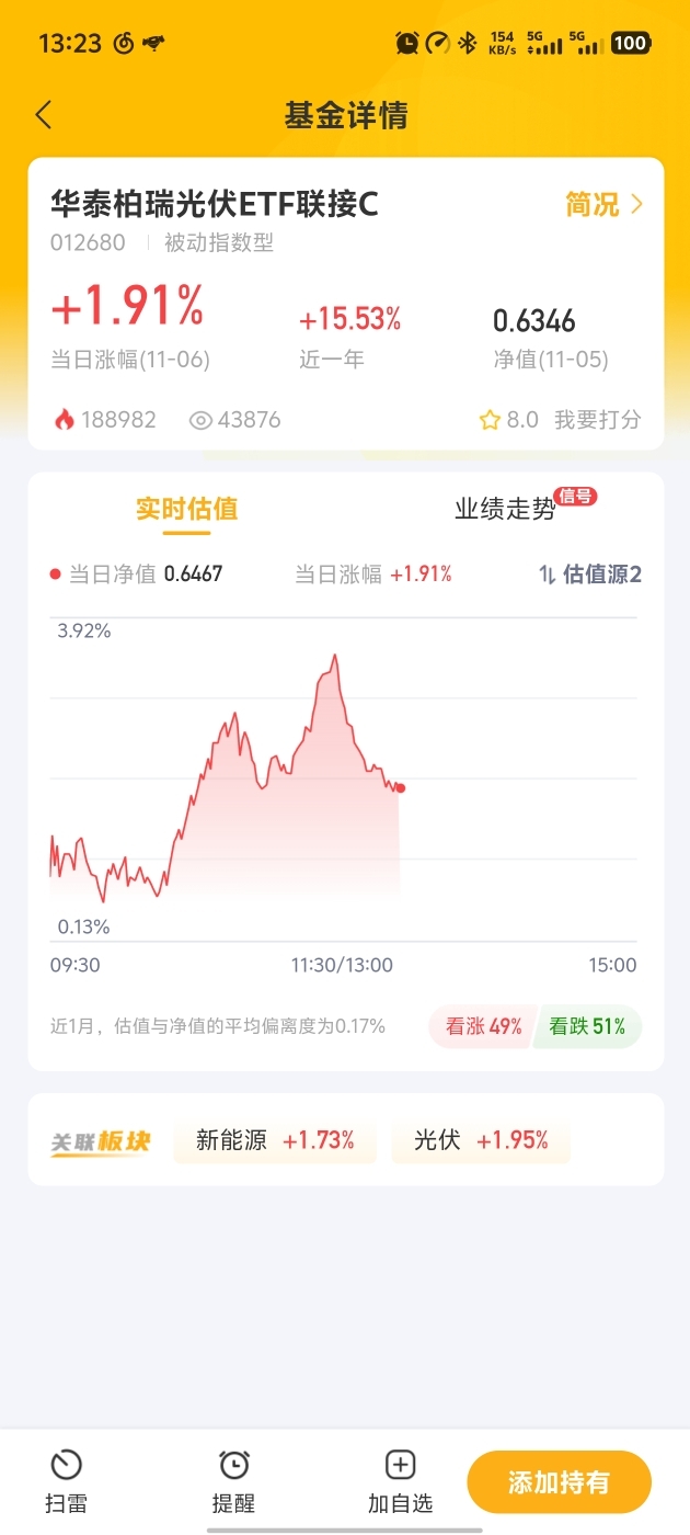 今天光伏板块的表现太给力了!一路高开高走,成为领涨先锋,看得人热血沸腾。前两年光伏行业真的太卷了,大家互相压价,最后谁都没赚到钱,整个行业都陷入困境。但现在政策发力反内卷,加上行业自己也在调整,落后产能被淘汰,供需关系慢慢平衡,基本面已经明显改善。而且光伏作为清洁能源,是未来的大趋势,全球需求都在持续增长。咱们普通人想把握这个机会,直接投个股风险太高,华泰柏瑞就是个好选择。它能打包光伏全产业链的优质标的,跟着行业一起成长,还不用自己费心选股盯盘。不过市场有波动,投资还是要保持平常心,不要盲目追高哦。