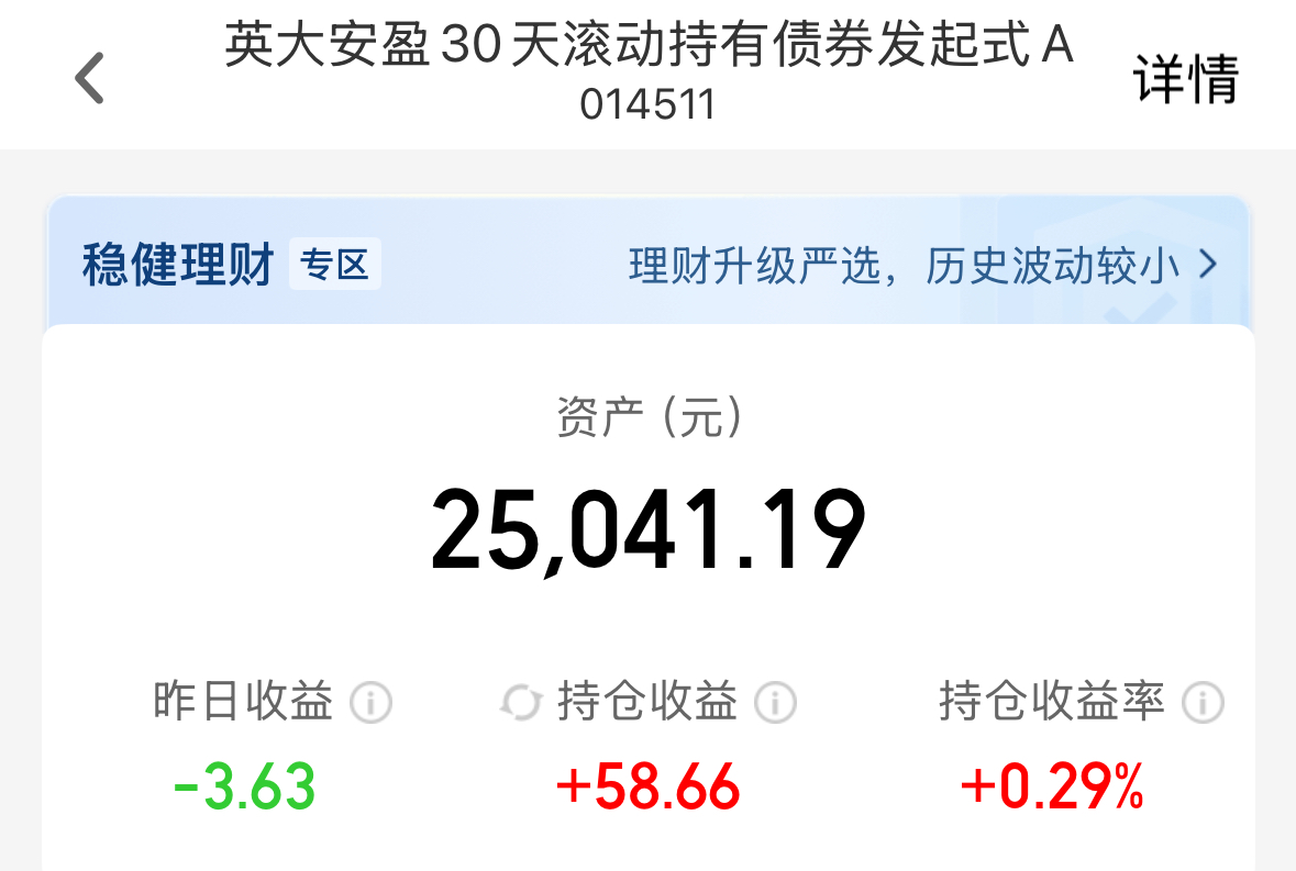 债市:今天债市分化,利率债一片艳阳天,信用债多云转晴。股市这边,大盘涨至3400点附近波动开始加剧,咩咩打算继续大额买债来压压惊,我今天大额加仓5000元绩优纯债基金$英大安盈30天滚动持有债券发起式A(OTCFUND|014511)$