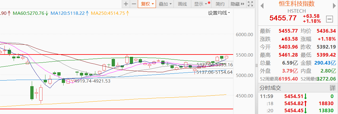 恒生科技突破在即,我今天再加5000元进来!5500的压力位并非坚不可摧,现在港股整体势头较好,港股新消费及创新药节节高升,随着行情不断发酵,只要情绪上来了,突破也是分分钟的事。