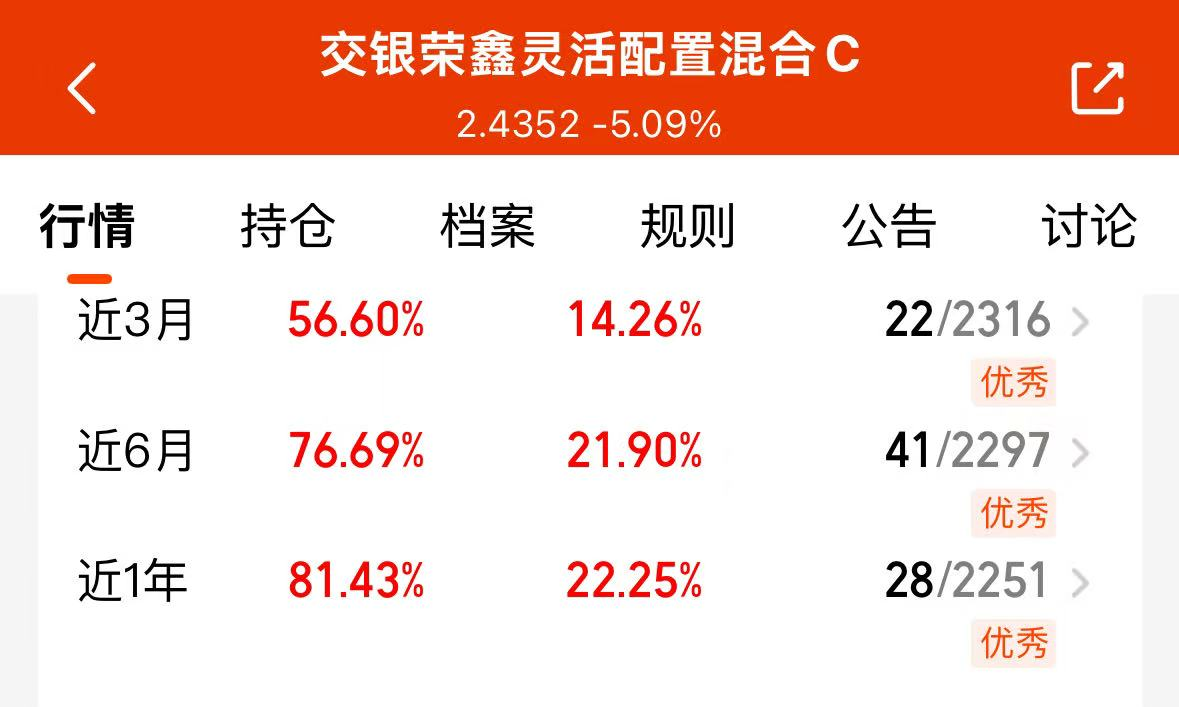 跌出性价比,速度抄底了!咩咩今天加了一份交银荣鑫灵活配置混合C,我之前就买了不少,业绩爆发力十足的一只科技主题基,重点投的是AI算力和人工智能。行情好的时候弹性大,可以快速跟上并创出超额来,近3月大涨56.6%,在2300多只同类产品中排名第22,近6月大涨76.69%在同类中也排名靠前。