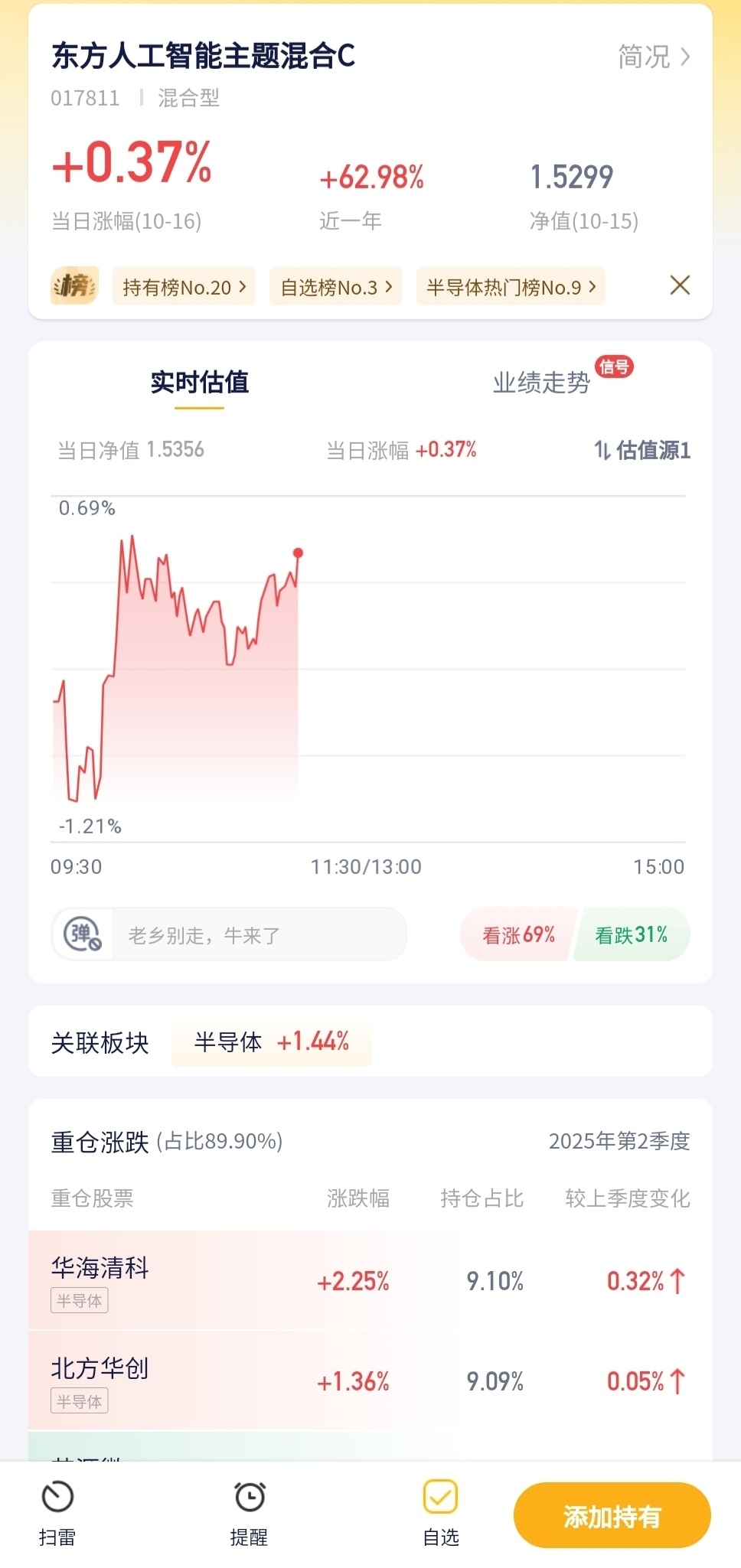 东方人工智能主题混合C今天涨了0.37%,人工智能板块今天表现一般般,就小涨了一点,可能是板块内部分个股有动静,带动基金微微上涨~