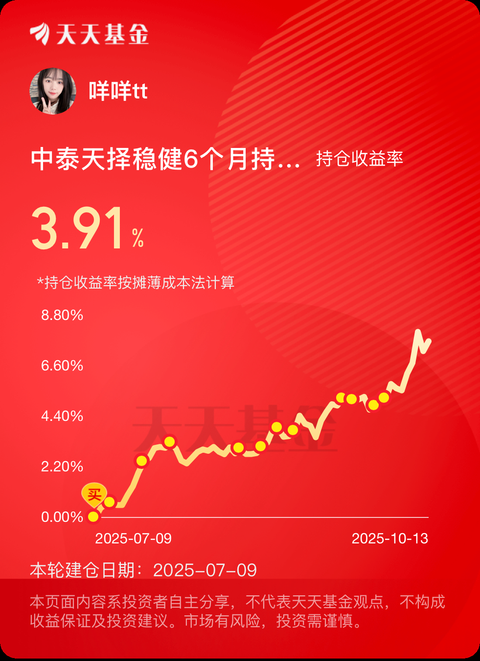 中泰天择可真是稳,闲钱投这个做底层配置确实没得说。咩咩7月进场分批配置,现在收益都近4个点了,一路稳稳创新高。节后市场巨震,中泰天择10月10号也只跌0.78%,连一个跌的跌幅都不到,这就是多元化配置的优势,不仅可以有效分散单一市场的波动,也能把握各市场收益机遇。中泰天择这波抗跌主要在于黄金,黄金占比约15%的样子,金价连续突破整数关口也使得中泰天择较好的抵御了权益市场的剧烈波动。股市短期估计还会以震荡为主,我手上的闲钱继续配置中泰天择来赚稳稳收益。