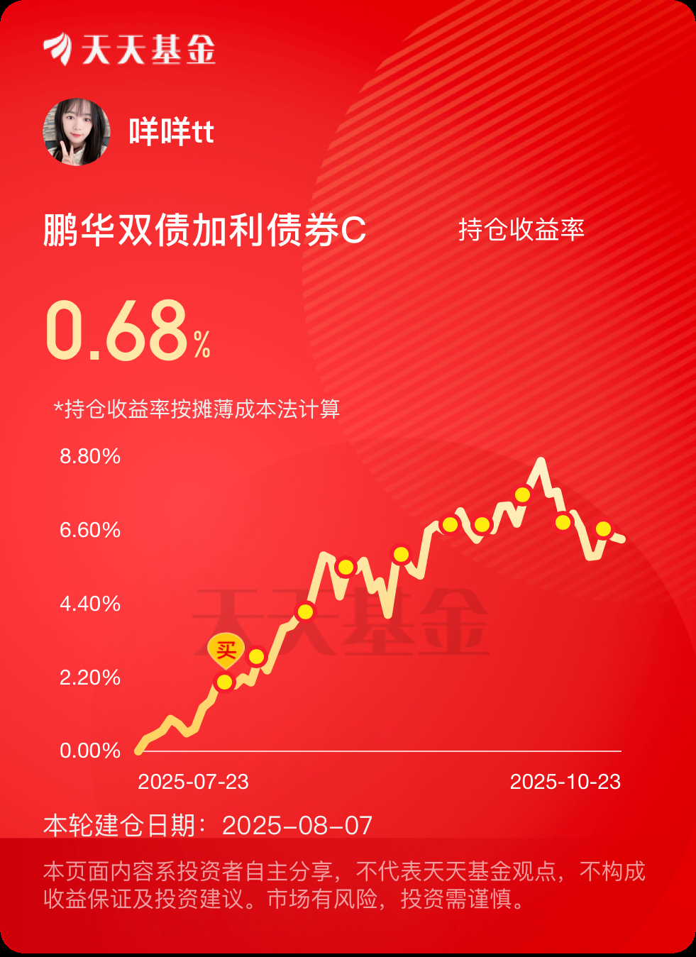 受股市波动影响,股债搭配的固收+策略近期也出现一些回撤,咩咩持有的鹏华双债加利也不例外,不过波动并不大还是能接受的!历史鹏华双债加利也受股市出现过较大回撤,比如年内4月最大回撤4.09%,但很快就修复并连创新高,年内涨幅高达15.37%,这个波动水平对应的收益进攻力我觉得也是相当优秀啦,整体表现还是可圈可点的,已经7个季度实现正收益了,比纯债基要强不少,做底仓配置拿在手上完全没压力。现在权益市场波动反而也提供了比较好的低吸机会,我今天继续加2000元。