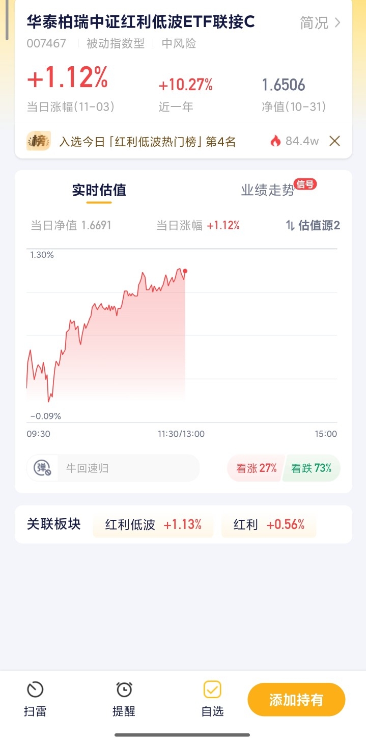 今天这市场还是磨人,涨涨跌跌没个准头,但红利低波板块倒是走出了稳稳的行情,红盘收尾不说,不少成分股还悄悄分红了,难怪都说这是“稳稳的幸福”。现在这环境,大家都怕踩坑,这种又有分红又波动小的板块就很吃香,毕竟股息就像安全垫,能缓冲不少风险。不想自己费劲选股票的,直接看华泰柏瑞就行,它专门盯这类高股息、低波动的资产,场外就能买,门槛不高,把钱放这儿比瞎折腾踏实多了。$华泰柏瑞中证红利低波ETF联接C$