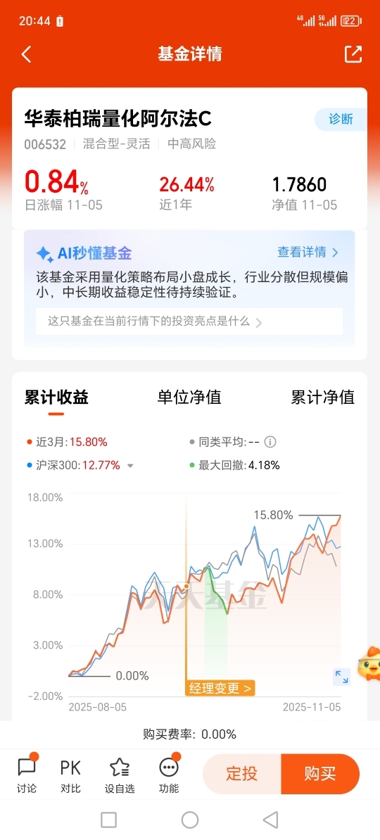 最近11月的市场,是不是感觉有点难下手?科技股前期涨猛了,现在宏观没动静,题材股却炒得风生水起。这时候量化基金的春天就来了,在小微盘机会多的行情里,量化策略能更精准地把握机会。华泰柏瑞值得关注,近1年收益超26%,近3月15.80%,比沪深300强太多。它的回撤控制也很优秀,最大才4.18%,趁着现在量化行情好,入手它试试,说不定能有不错的收获。$华泰柏瑞量化阿尔法C$ #科技热点摊开业啦#
