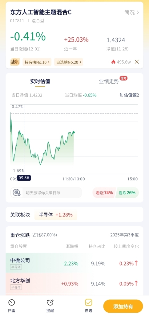 东方人工智能主题混合C今日预估跌幅0.41%!