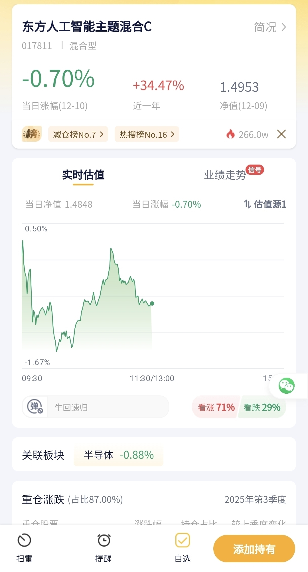人工智能主题基金今天跌了0.7%,AI板块近期一直缺乏持续的利好刺激,板块内个股轮番调整,这只基金重仓的人工智能相关标的今天集体走弱,自然也就跟着下跌了,短期看板块还得磨一磨。