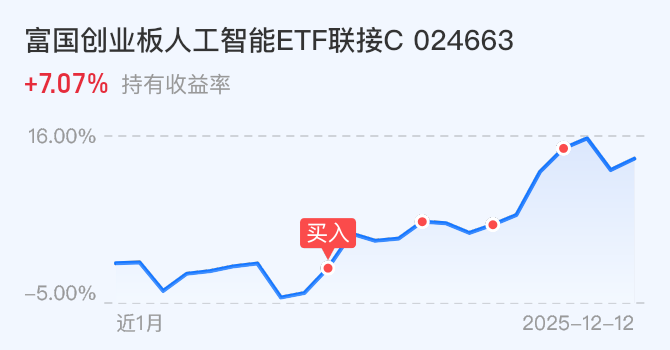 人工智能:+1000$富国创业板人工智能ETF发起式联接C(OTCFUND|024663)$,当前估值-1.92%,跌幅还是蛮大的,这只基金跟踪创业板人工智能指数,成分股聚焦AI算法、算力基础设备、数据要素等核心环节,持仓集中度更高弹性更大,其中光模块龙头占比超50%,前市长重仓包括中际旭创、新易盛等光模块龙头,近一周+6.67%,进一个也+1314%,成立以来+52.53%,业绩表现优秀赚钱能力强,当前AI算力发展迅速潜力大,相关利好较多,投资确定性高,调整就是机会,分批加起来。