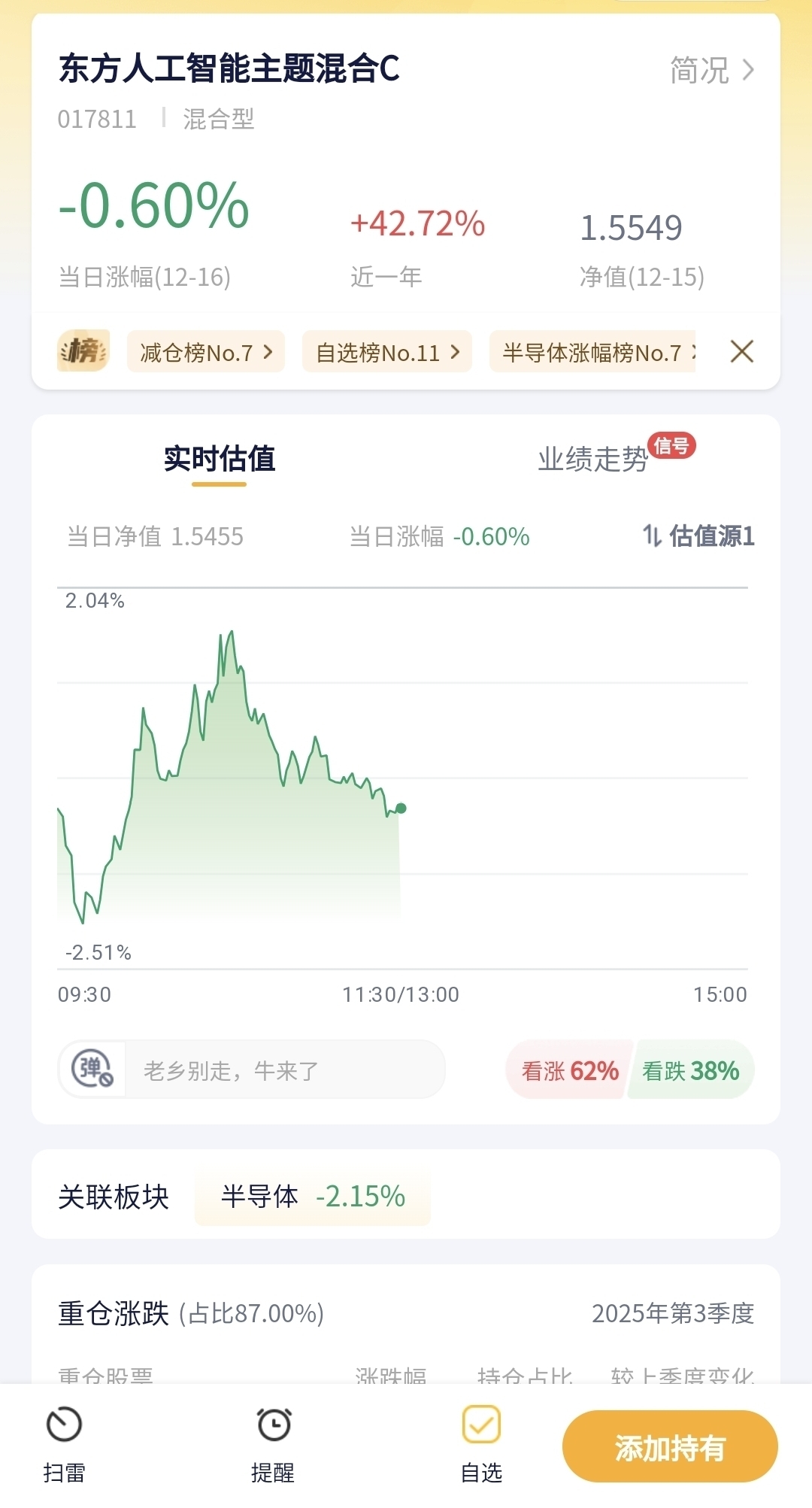 人工智能主题基今天跌了0.6%,人工智能板块今天分化挺明显的,部分细分赛道的个股走弱,这只混合基持仓里相关标的受影响,就跟着出现了小幅下跌,好在跌幅不算深,暂时不用太慌。