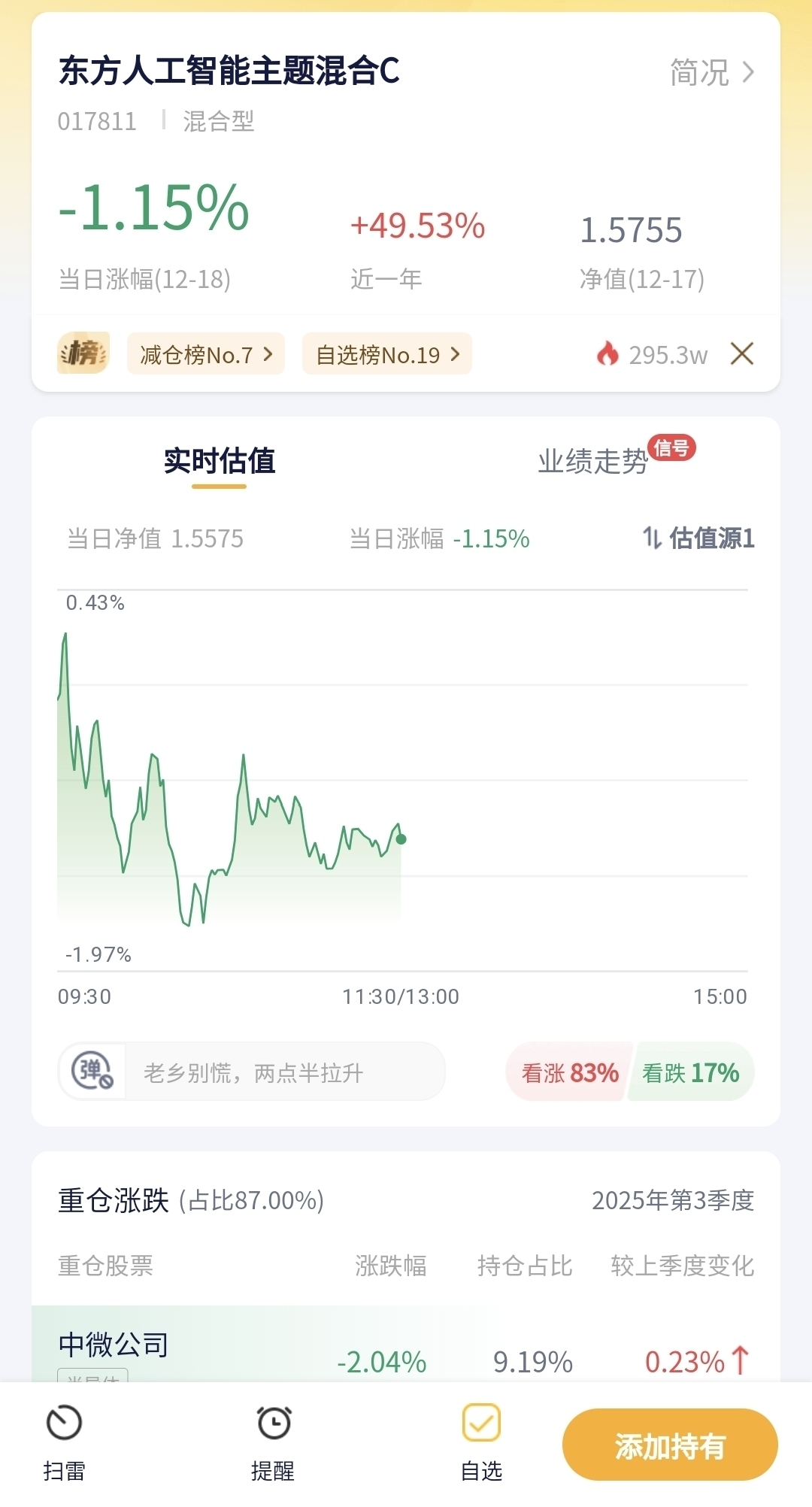东方人工智能主题混合C跌了1.15%,人工智能板块今天直接栽了,算力、应用端的个股全没撑住。这只基金主打AI主题,重仓的标的都在这个赛道里,板块一跌基金肯定跑不了,而且现在市场对AI的炒作热度降了不少,资金都往其他方向挪,短期还得等板块有新利好才能翻身。