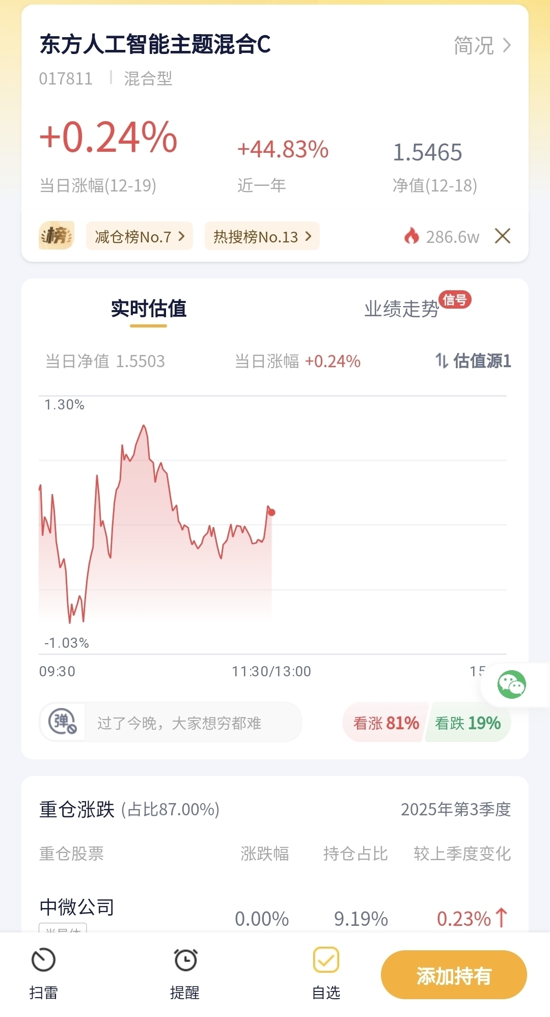 人工智能主题今天表现一般,这只东方的基金只涨了0.24%。AI板块近期波动一直比较大,今天虽然有部分AI概念股小幅拉升,但整体板块的热度不算高,资金参与的积极性也一般,这只聚焦人工智能的基金,因为板块整体表现平平,所以预估涨幅也比较小。能看出AI赛道目前还是处于震荡整理的阶段,暂时没走出强势的行情。