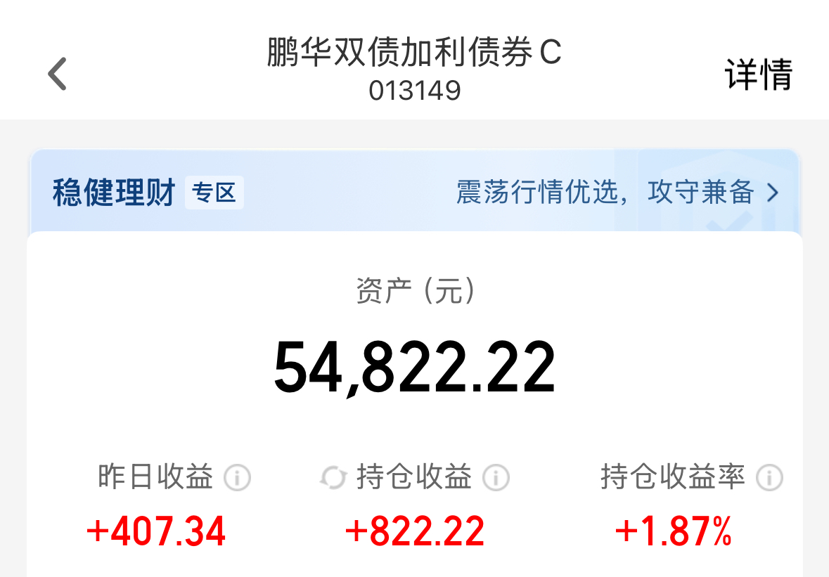 行情好起来,我买的鹏华双债加利债券C就开始收恐龙蛋了!昨天大蛋92个!!!我的4万多本金直接赚了400+,什么概念啊,存定期1年差不多也就这么多。咩咩早就说了吧,鹏华双债加利债券C回调的时候说了是低吸机会,产品作为一只混合二级债,信用债构筑安全垫的同时还有投可转债和股票,而股票当前投的是有色、科技这些热点行业,涨起来弹性十足,现在你们信了吧!好在回调的时候我是一点也没怂,陆陆续续加不了不少仓位,已经拿到1.87%的收益,照现在这势头看创新高指日可待。趁着现在趋势正猛,我加大仓位继续投。