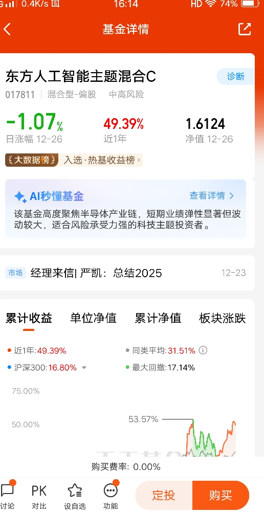 对于2026年的投资,我看好人工智能,虽然2025年人工智能板块也有过大幅上涨,但2026年我依然看好该赛道。人工智能就代表着科技发展的核心,所有的科技产品都离不开人工智能这一技术,人工智能技术决定着科技产品的研发速度,而且十五五规划也提到,未来五年人工智能是政策大力扶持的。所以我看好它。$东方人工智能主题混合C$ @东方基金