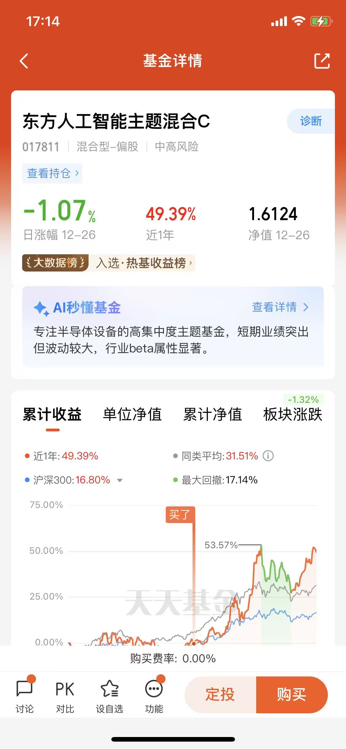 说说我的持基经历吧。我是今年七月入手的东方人工智能C,当时选这只基金的时候,我也是琢磨了挺久的:核心想法就是看好国内半导体自主可控的大趋势——毕竟科技强国是大方向,半导体作为科技产业的“基石”,尤其是那些被“卡脖子”的关键环节,未来肯定能拿到政策和资金的双重支持。持有到现在,这只基金的表现比我预期的还好,当前收益率已经到49.80%了,接近50%的收益,作为长期拿着基金的我来说,真的挺满意的。