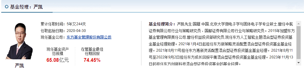 此基金由严凯先生执掌,我甄选此基金时,曾深入研究过他的履历:北京大学微电子学与固体电子学专业硕士,科班出身的背景,让他对半导体行业的理解远超常人。他兼具多年行业研究与基金管理经验,曾任职于中航证券、国都证券从事行业与策略研究,2015年加盟东方基金后,从研究员稳步成长为基金经理,执掌过东方新策略、东方创新科技等多只科技相关基金,实战经验积淀深厚。其管理风格深耕行业、精挑个股,摒弃频繁调仓的浮躁,以稳健之姿践行长期投资理念,恰与科技赛道的投资属性相得益彰。