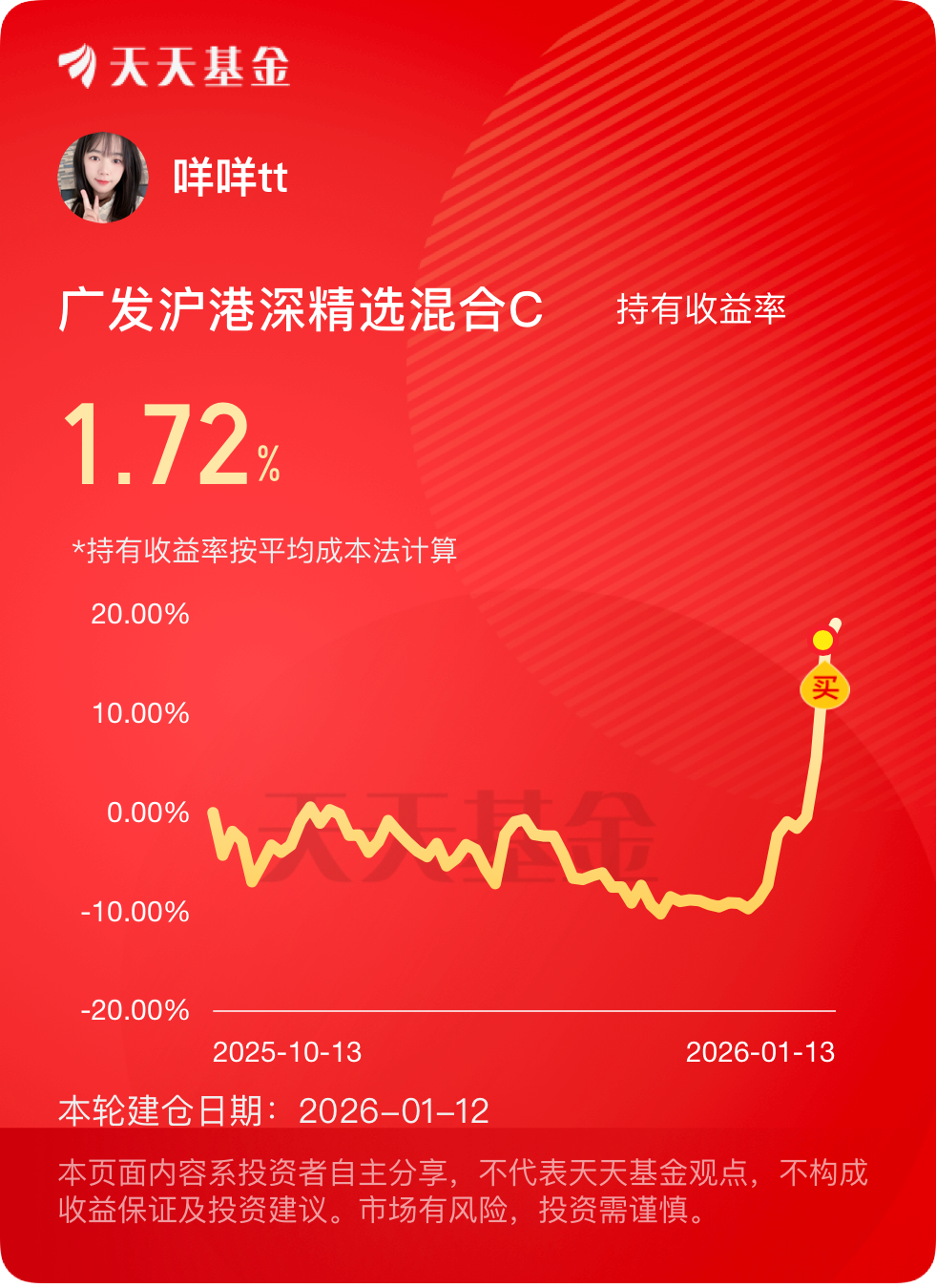连追连涨,连涨连追。且不说业绩弹性有多大,AI应用这波的持续性也很好,近1月广发沪港深精选涨了28.51%。你要问我怕不怕,那自然是怕的,只是牛市中如果因为怕就不敢上车,那我又怎会吃到这两天的上涨呢。