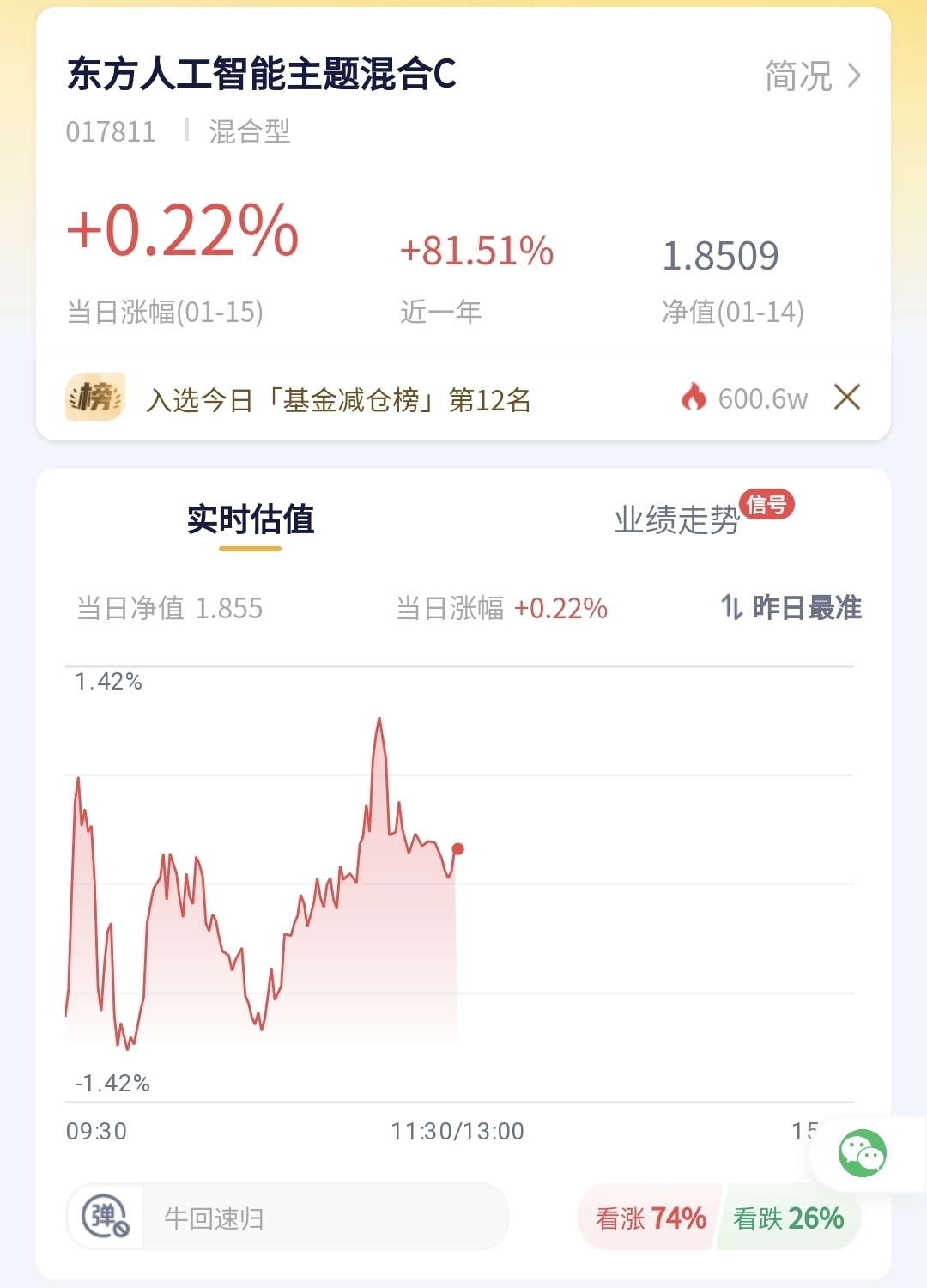 今天多数基金都在跌,这只东方人工智能主题混合C却涨了0.22%,算是持仓里的“独苗”。人工智能板块今天有利好消息刺激,相关的AI应用、算力个股小幅拉升,基金重点布局了这个赛道的优质标的,跟着板块吃到了小幅上涨,弱势行情里表现算不错的。