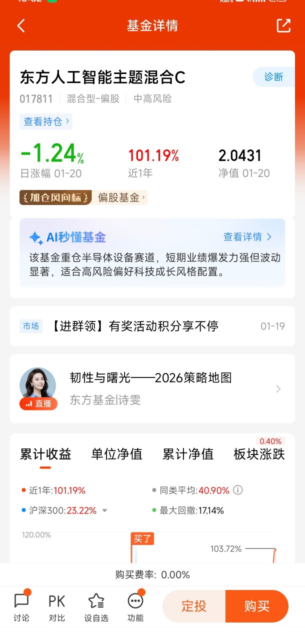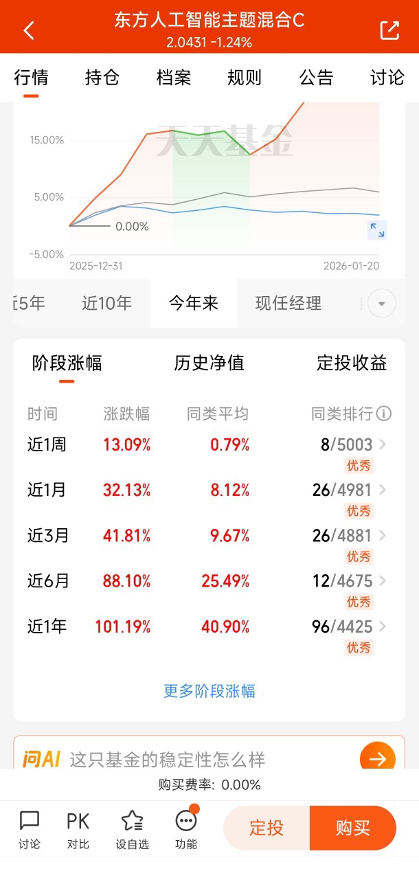 细看基金的表现,截至2026年1月20日,该基金近一年收益率达101.19%,近一月涨幅32.13%,今年以来的涨幅也达到27.2%。这样的业绩表现,让我这个“躺平派”投资者感到既惊喜又欣慰。