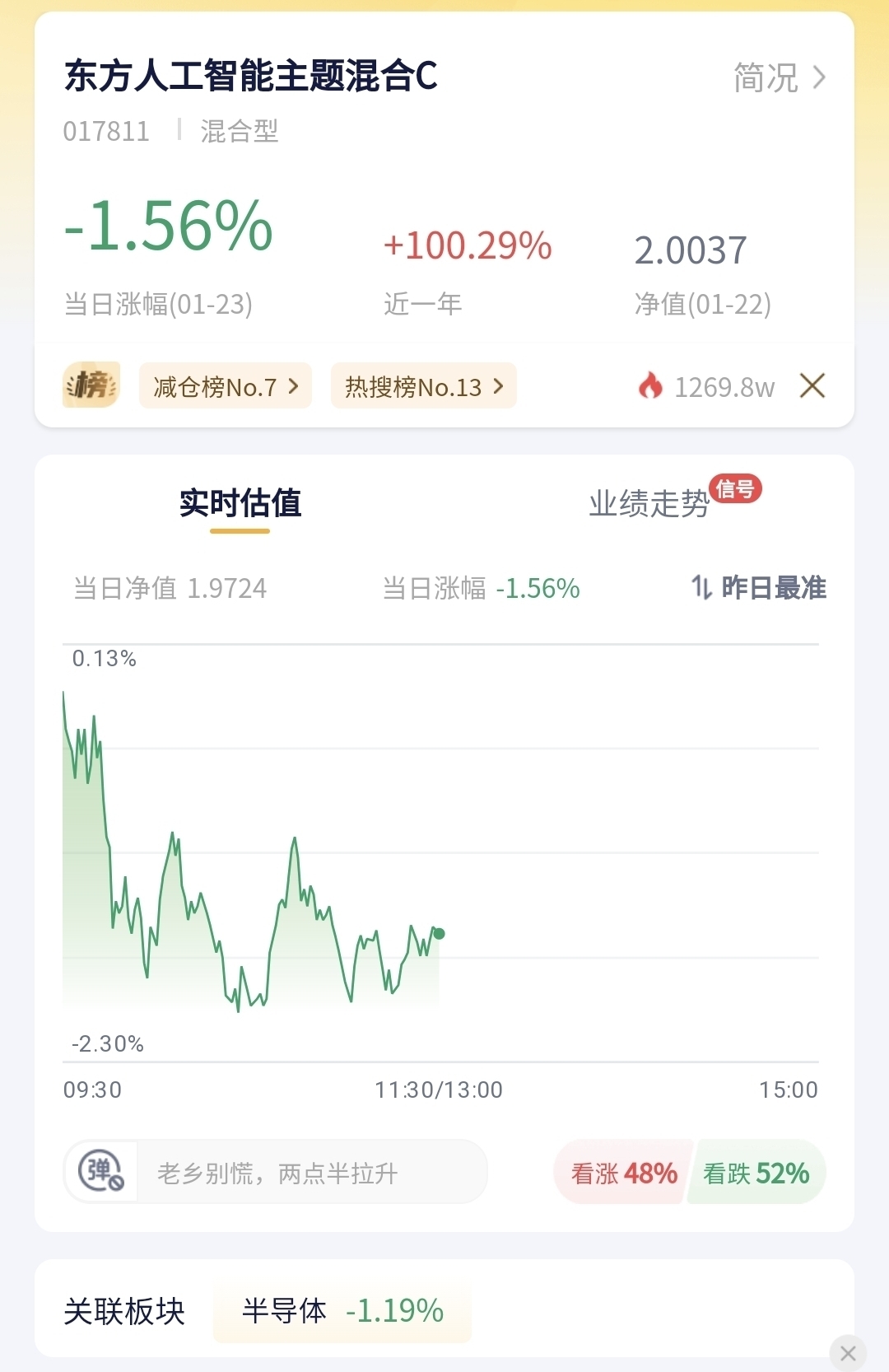 东方人工智能主题混合C今日预估跌幅1.56%!