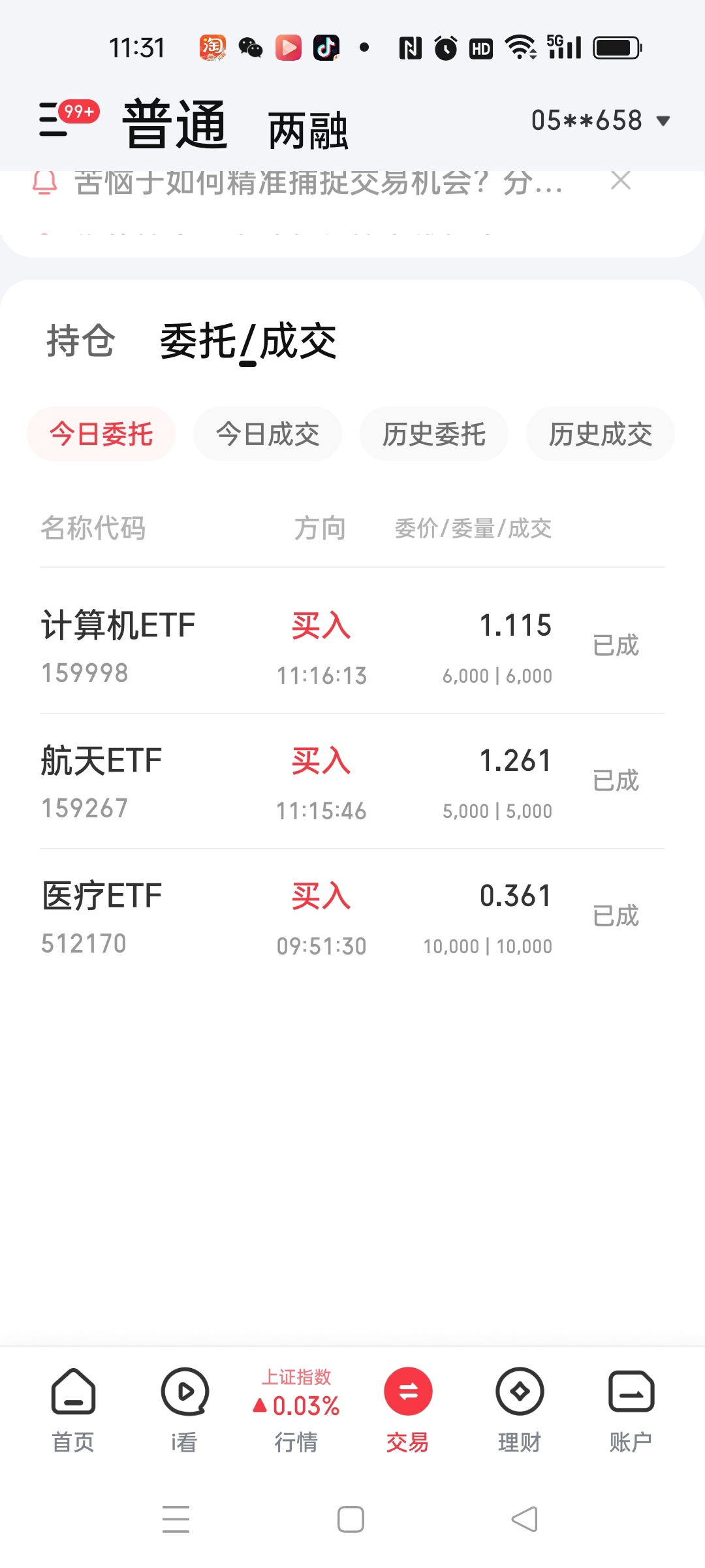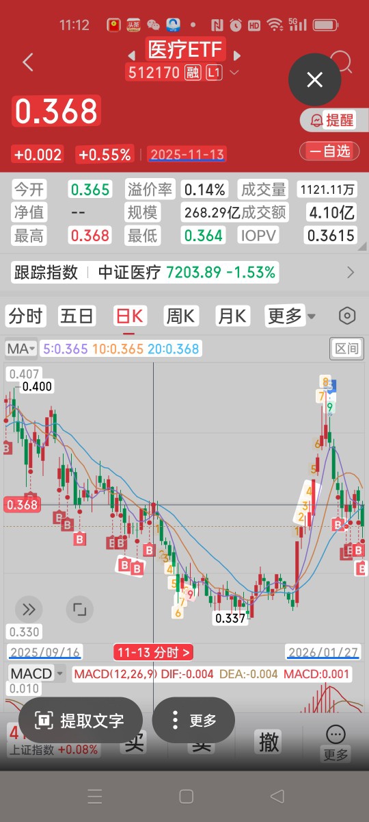 今天上午我用股票账户买了代码:159267航天ETF,1.261元买进去的,属于补仓一单,前几天是1.293买的,打算做些高抛低吸的差价,场内的ETF是比较活跃的,比场外的基金要活跃。另外又买进去了代码:159998计算机ETF,1.116元买的,也是算目前价格的低吸吧,也是打算低吸高抛的操作。至于代码:512170医疗ETF,今天上午也是再买一万份额,前几天这个基金在1.39左右高抛后,如今又陆续的买回来了,这样的就是典型的高抛低吸,只要你会操作就行了。