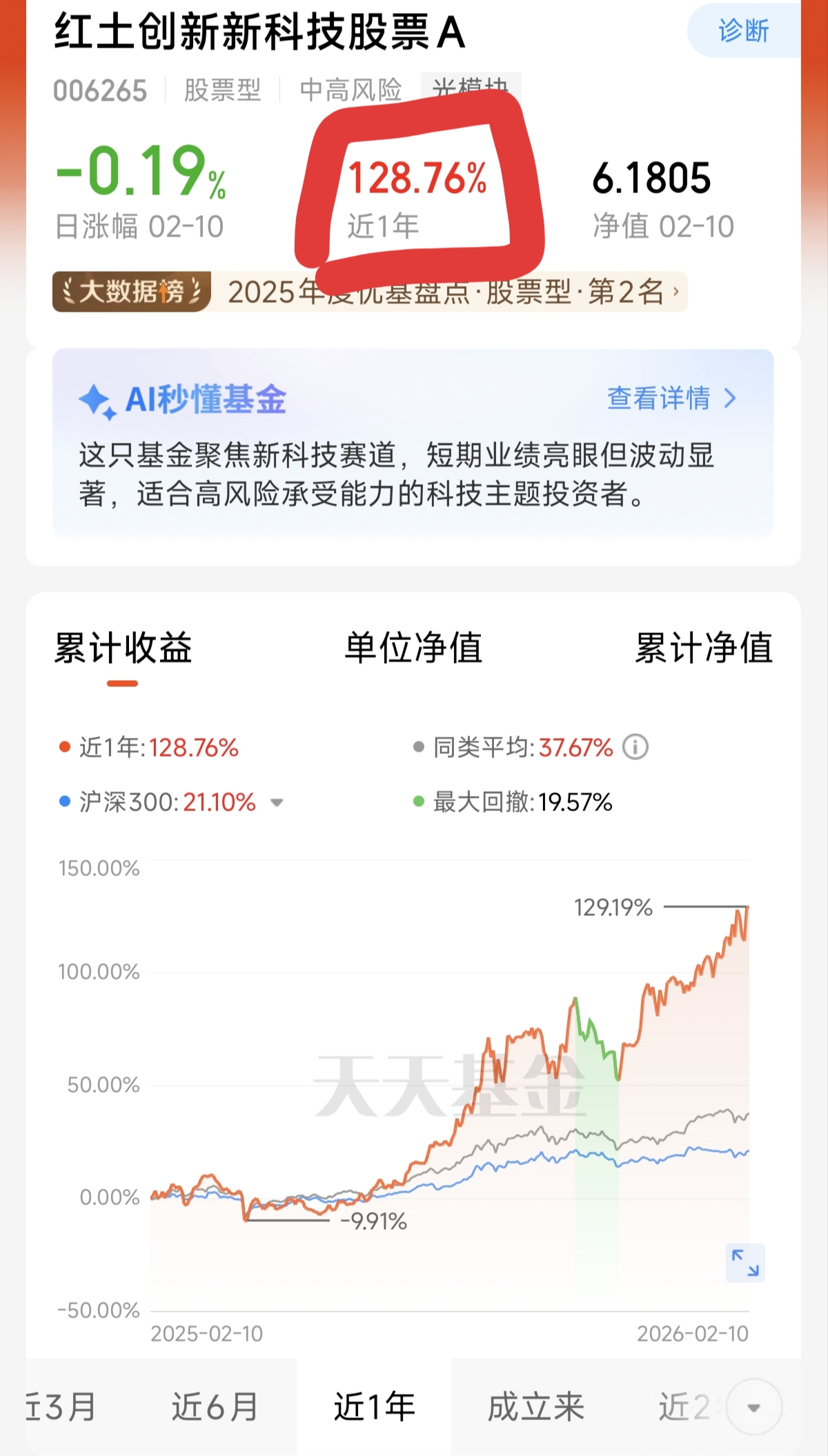 红土创新新科技股票 A(006265)持仓特点格外鲜明,全程紧盯 AI 算力基建核心硬件赛道,布局思路清晰又聚焦。基金重仓新易盛、中际旭创等全球光模块龙头,同时布局天孚通信这类精密光器件与光引擎核心供应商,还持有沪电股份等高端服务器 PCB 厂商,全是 AI 算力产业链上的关键环节。在基金经理盖俊龙紧扣产业链核心的集中布局下,基金业绩表现十分突出,近一年回报高达128.76%,领先同类平均水平。