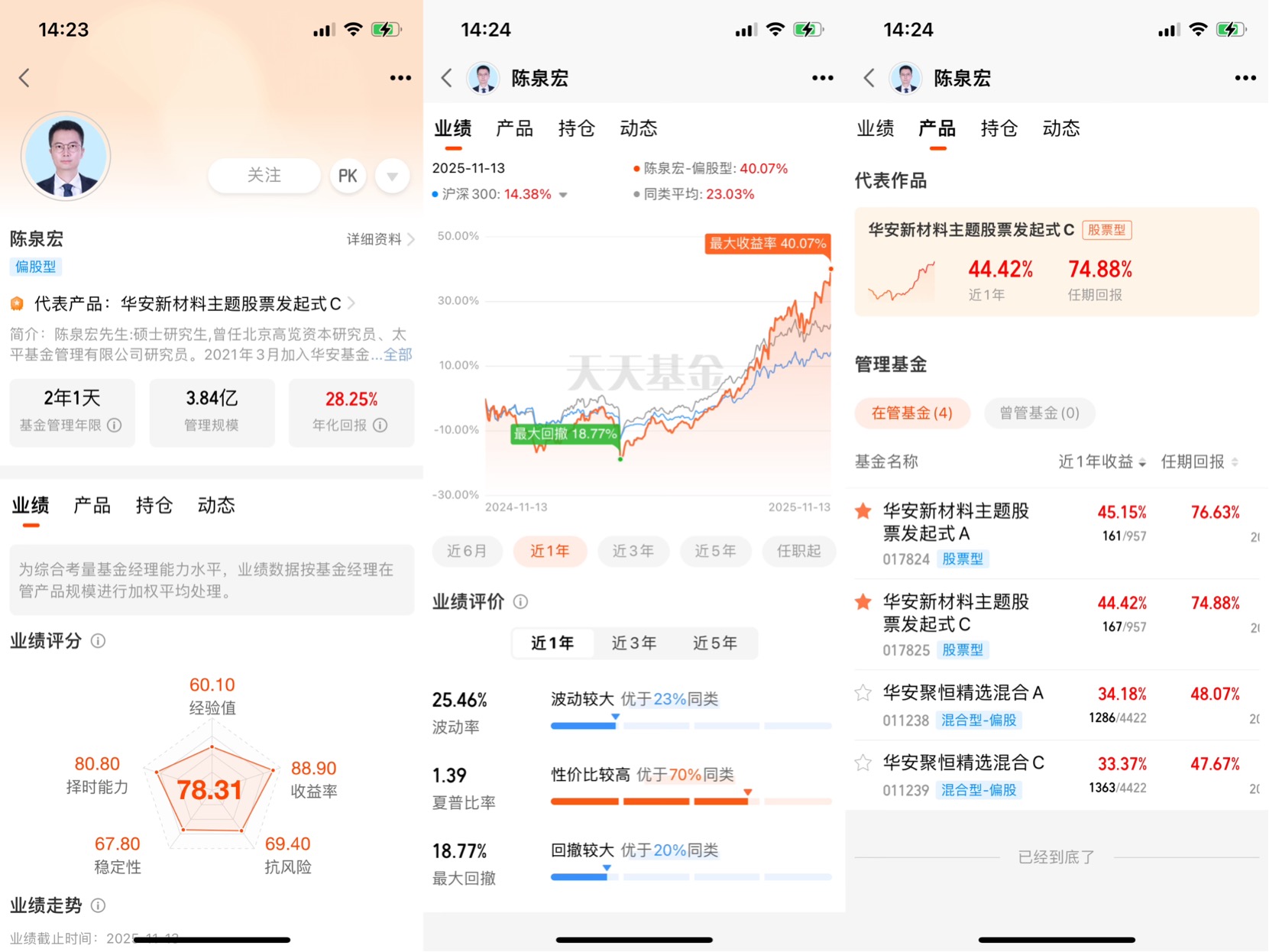 一开始我也担心,基金经理陈泉宏才从业2年,会不会经验不够?但看了他的业绩,我就放心了——他管理这只基金的任期回报是74.88%,近1年收益44.42%,比很多老基金经理都强。