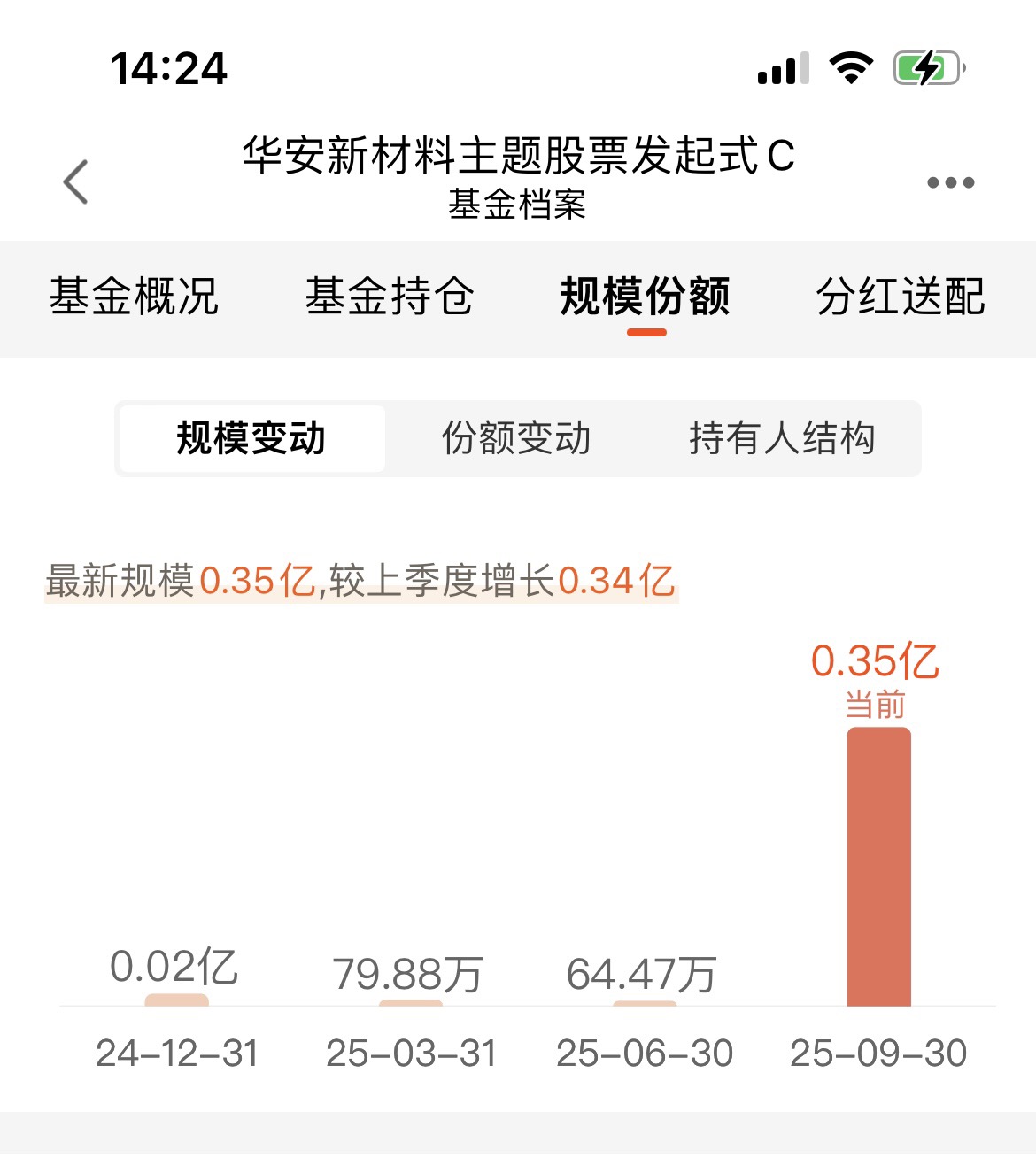 很多人喜欢买“大基金”,觉得规模大安全,但我觉得小基金有小基金的好——尤其是在新材料这种波动大的赛道里,规模小反而灵活。这只基金现在规模才0.35亿,相当于“船小好调头”,行情来了能快速加仓,行情不好也能及时减仓,不会因为规模太大而“买不进、卖不出”。