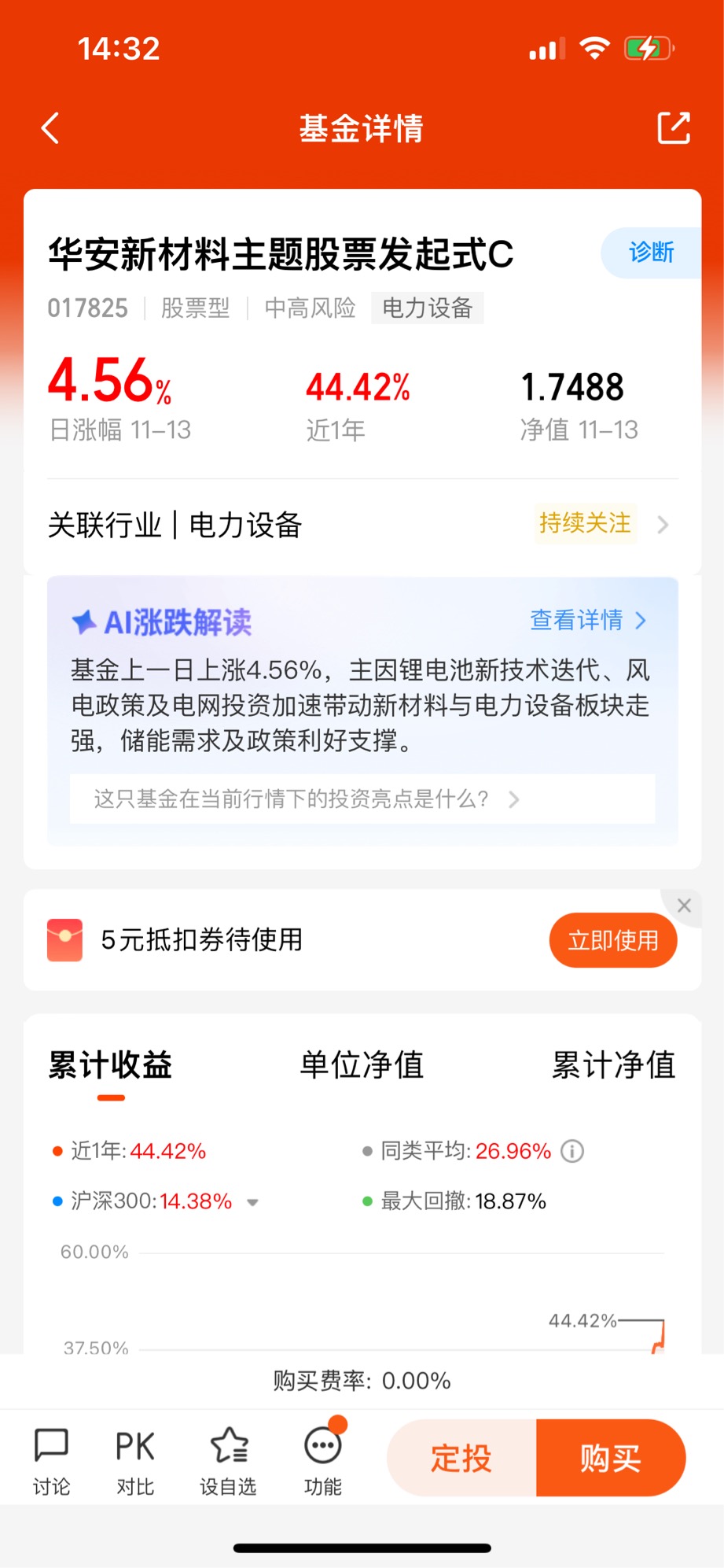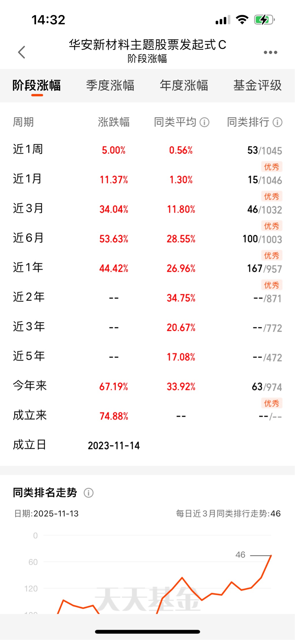 咱买基金图啥?不就是想赚钱嘛!这只华安新材料C的业绩,真的让我没法不心动。你看数据:近1年涨了44.42%,同类平均才26.96%;近6个月直接飙了53.63%,把同类平均的28.55%甩了一大截;今年以来更狠,涨了67.19%,比同类平均的33.92%翻了快一倍。成立刚满2年,累计收益已经74.88%,这是什么概念?相当于每年差不多赚37%,比很多理财、存款香太多了。