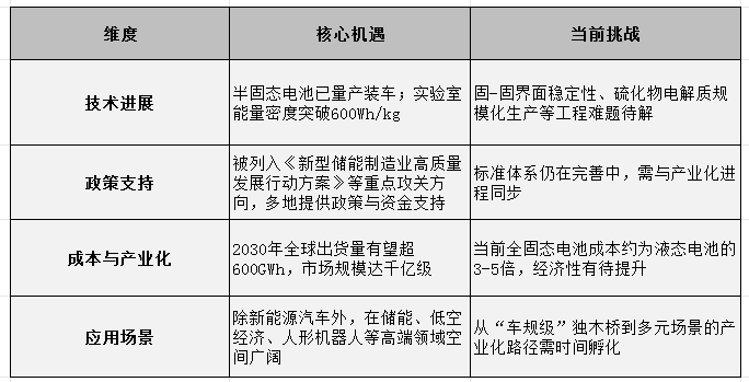 固态电池的产业化并非一蹴而就,预计将经历样品交付(2025-2026)→小规模量产(2027-2028)→规模化应用(2030年后) 的阶段。这意味着投资机会将是渐进的,且会沿产业链上下游扩散。